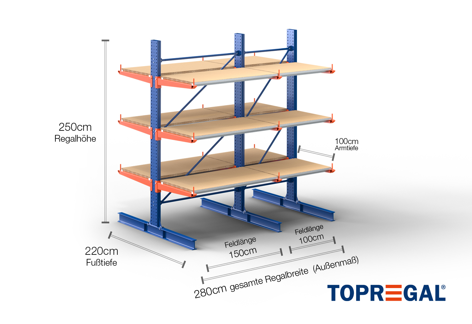 2,8 m cantilever rack KR3000 / Painted / Double-sided / 2,5 m high / 100 cm cantilever depth / 3 levels / rack layer Wood