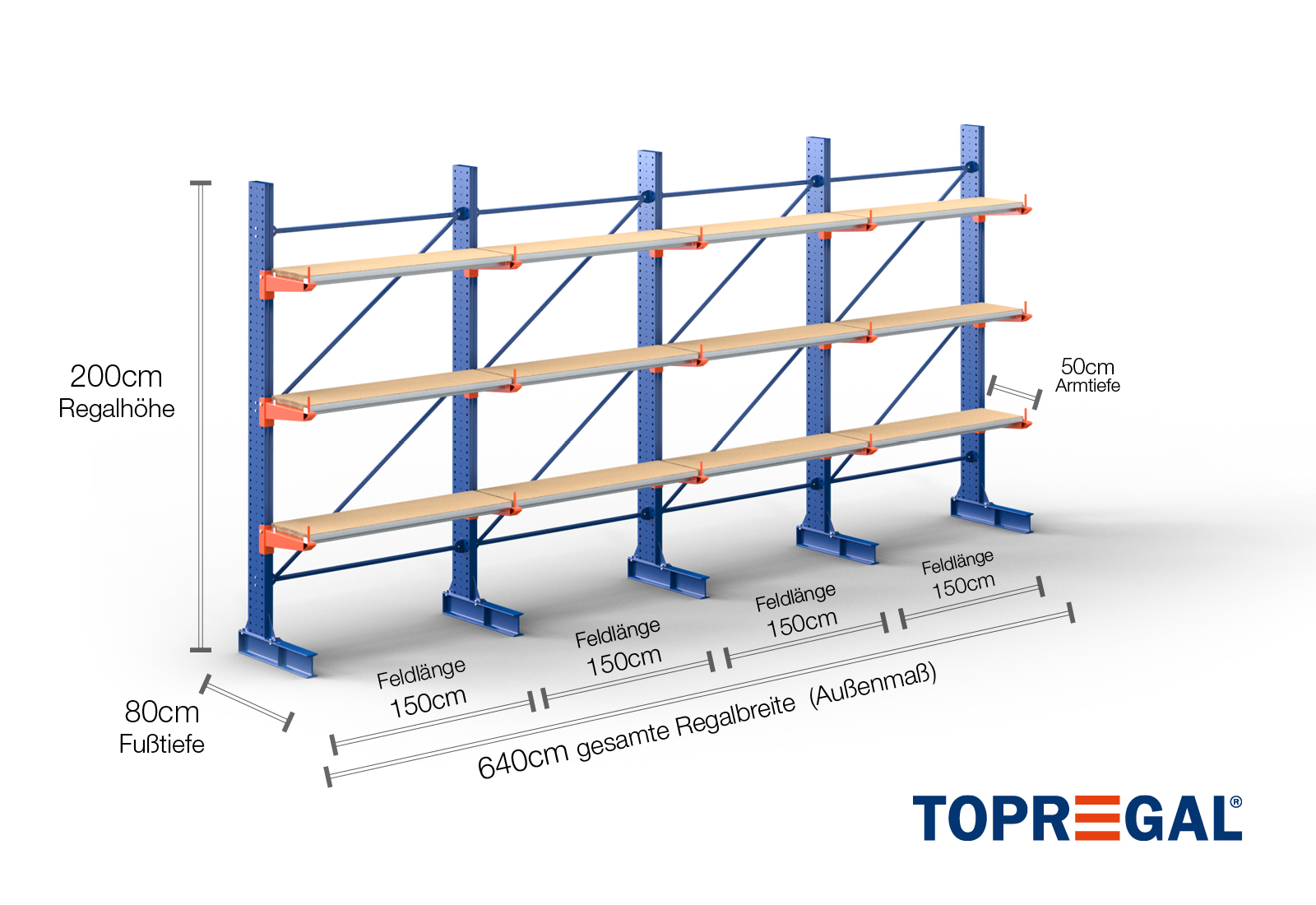 6,4 m cantilever rack KR3000 / Painted / One-sided / 2 m high / 50 cm cantilever depth / 3 levels / rack layer Wood