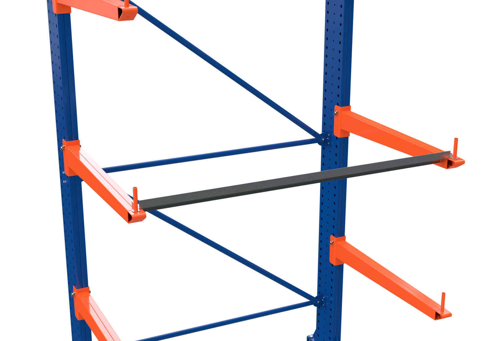 Using the shelves, the rack can be loaded with pallets, buckets containing liquids, barrels, parcels or transport boxes, for example. In addition, the shelves prevent goods from falling and long goods from sagging between the cantilevers.