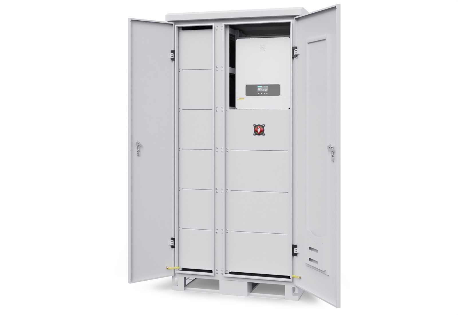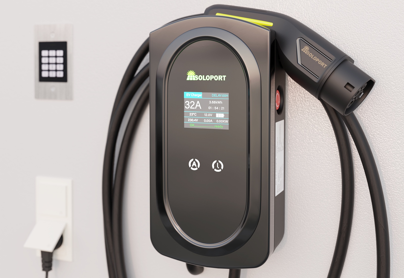 A keypad is attached to the side of the control cabinet, which activates the charging current by entering a code. This prevents unauthorised use by third parties. After activation, the wallbox, which is also attached to the outside of the control cabinet, can be used with a charging capacity of 1,4 - 7,3 kW. This can be set in seven stages for charging your electric car. There are two 230 V sockets next to the wallbox, which are practical and easy to access. This means that not only your electric car benefits from green electricity, but also other electrical appliances such as hoovers, lawn mowers and other tools. Of course, e-bike batteries and other battery-powered devices can also be charged safely.