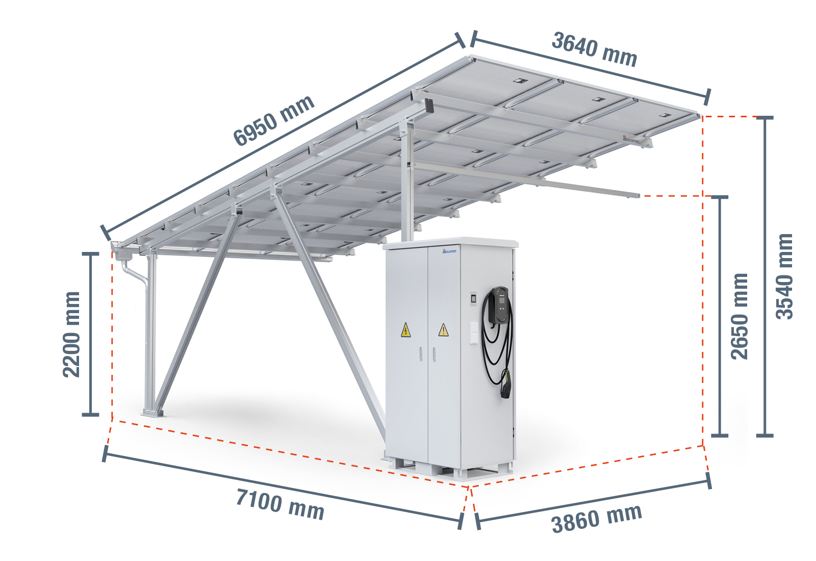 Solar carport add-on bay SP40/5-1A incl. wallbox, control cabinet and rain gutter, Aluminum, drive-through height 2.200 mm, SoloPort