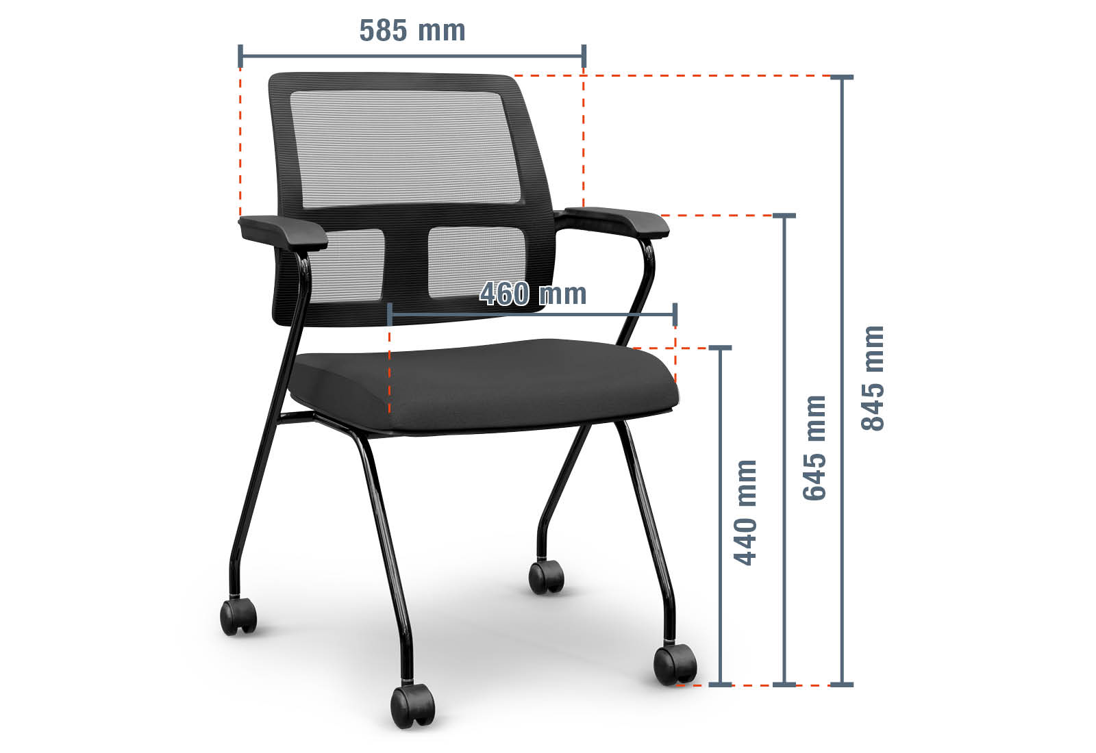EMMA conference chair is a chair with castors in subtle black. The backrest is 385 mm high and made of breathable mesh fabric. The chair has a seat height of 440 mm and a seat surface of 460 mm x 450 mm. The black armrest is 655 mm high. The solidly constructed castors, the armrests made of durable plastic and the seat made of high-quality foam ensure comfortable seating. The EMMA model is a conference chair with a folding function. Short delivery time, easy assembly.