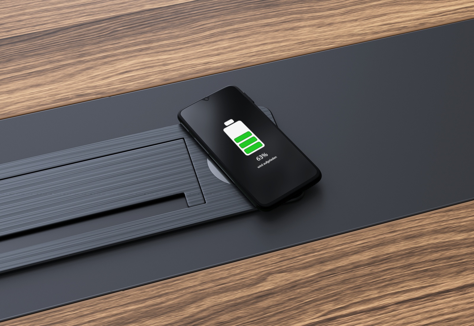 To power the necessary office equipment, ANJA280i has a cable duct on both sides, including 4 sockets (type CEE 7/17 - plug type C) and a cable channel, which ensures more order and space on the table. Wireless charging of mobile phones is also possible thanks to the two induction charging surfaces, which complete the equipment for conferences and meetings. All mobile phones that support wireless charging are compatible.