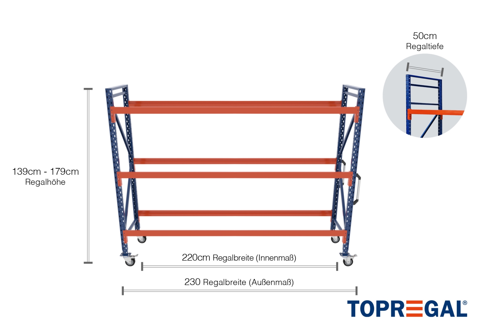 2,3 m mobile individual rack IR2000 / 1.390 - 1.790 mm high / 50 cm deep / 3 levels