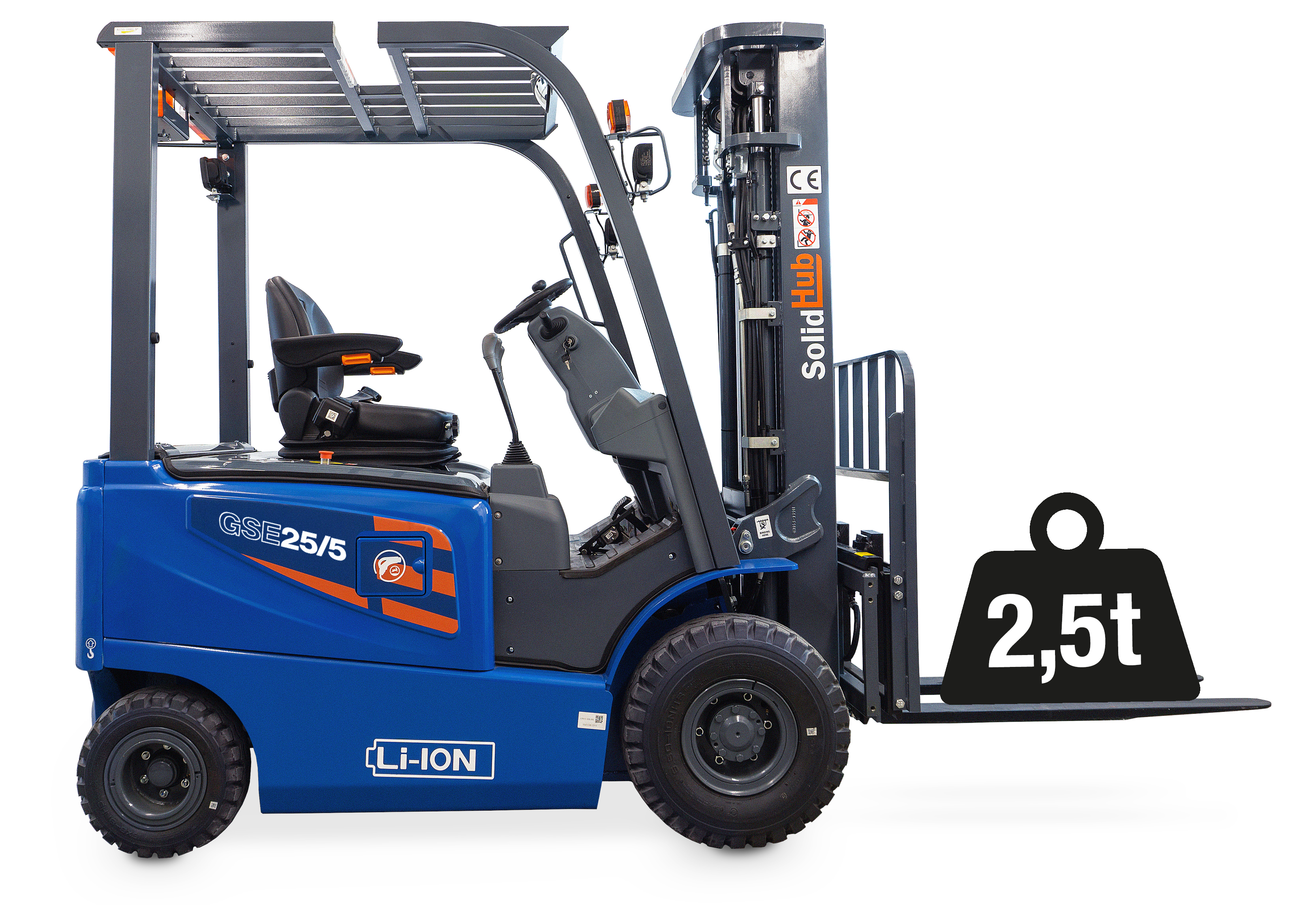 - 1 x LI-ION electric forklift GSE25/5 with integrated charger, load capacity 2.500 kg, SolidHub