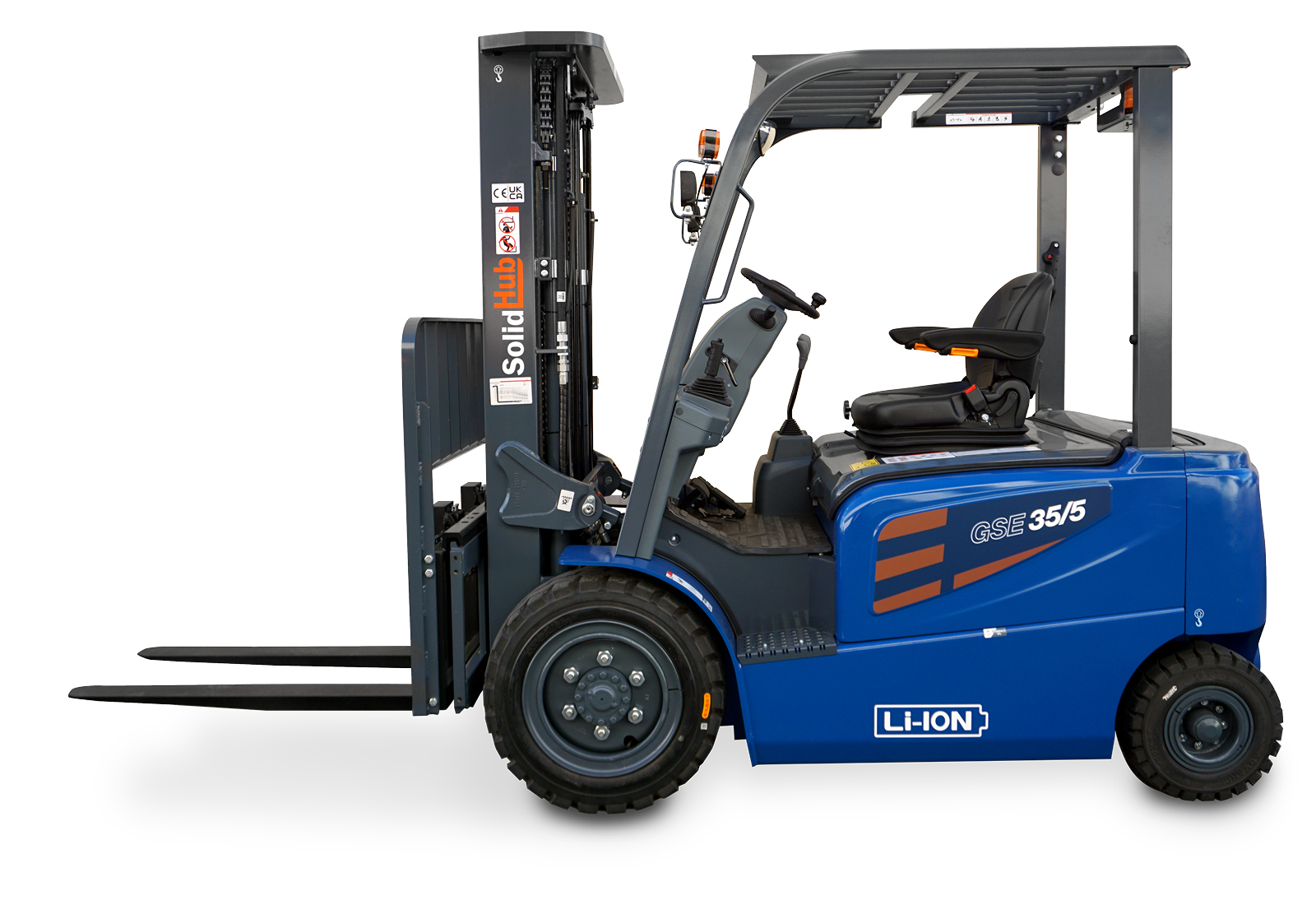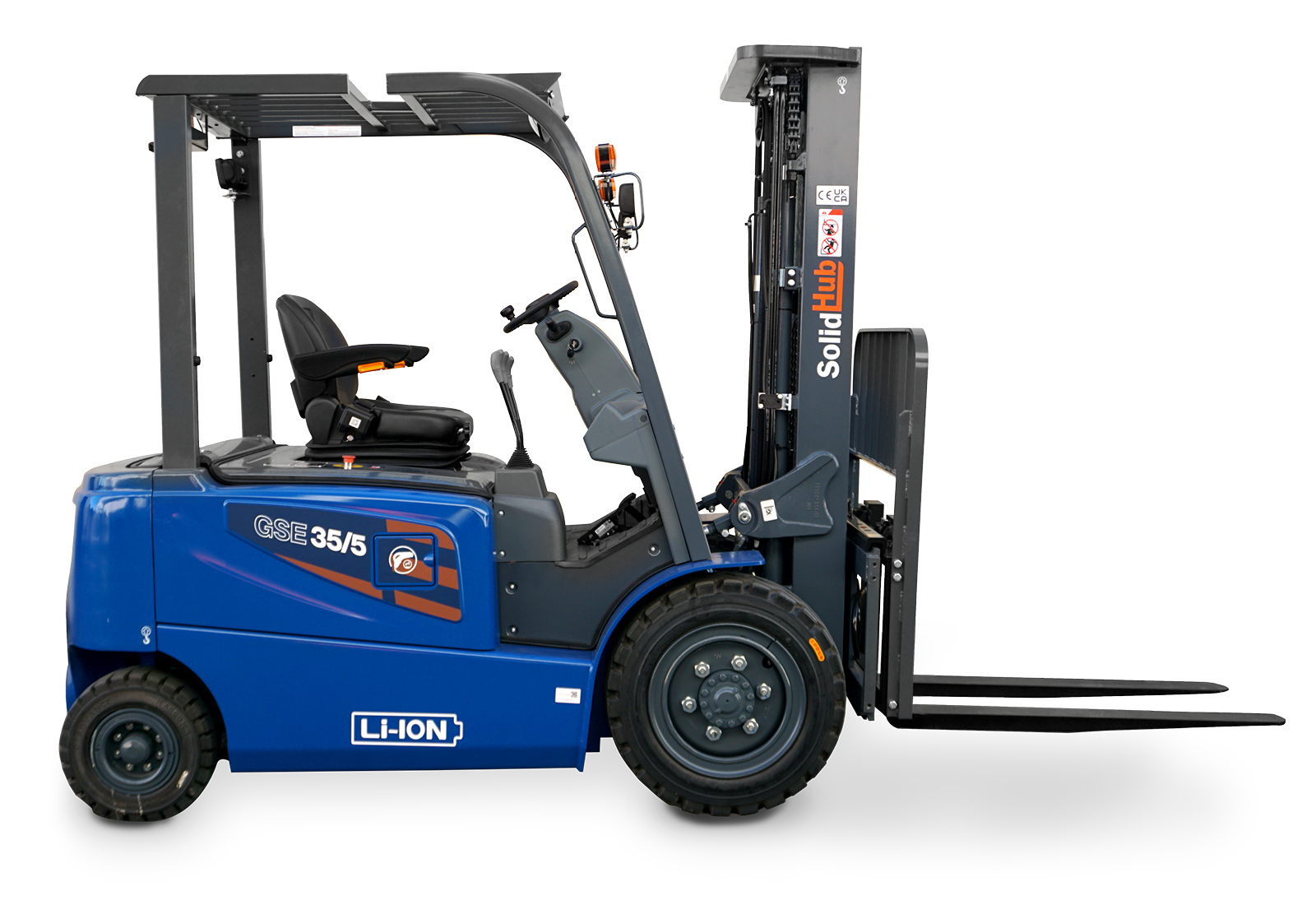 - 1 x LI-ION electric forklift GSE35/5 incl. 380 V / rapid charger, load capacity 3.500 kg, SolidHub