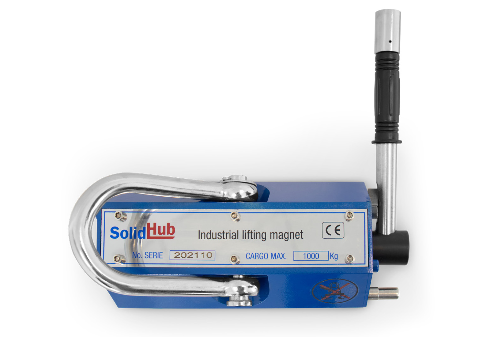 Now SolidHub has the solution: the LHM10 industrial lifting magnet lifts loads of up to 1.000 kg with ease. Just place the device on the smooth surface of a sheet and flip the lever. The sheet can then be lifted using a crane or other lifting device. This is done by simply hooking a sling or hook into the shackle. The compact lifting magnet (230 mm x 410 mm x 260 mm) weighs just 33 kg, which helps with transport and handling.