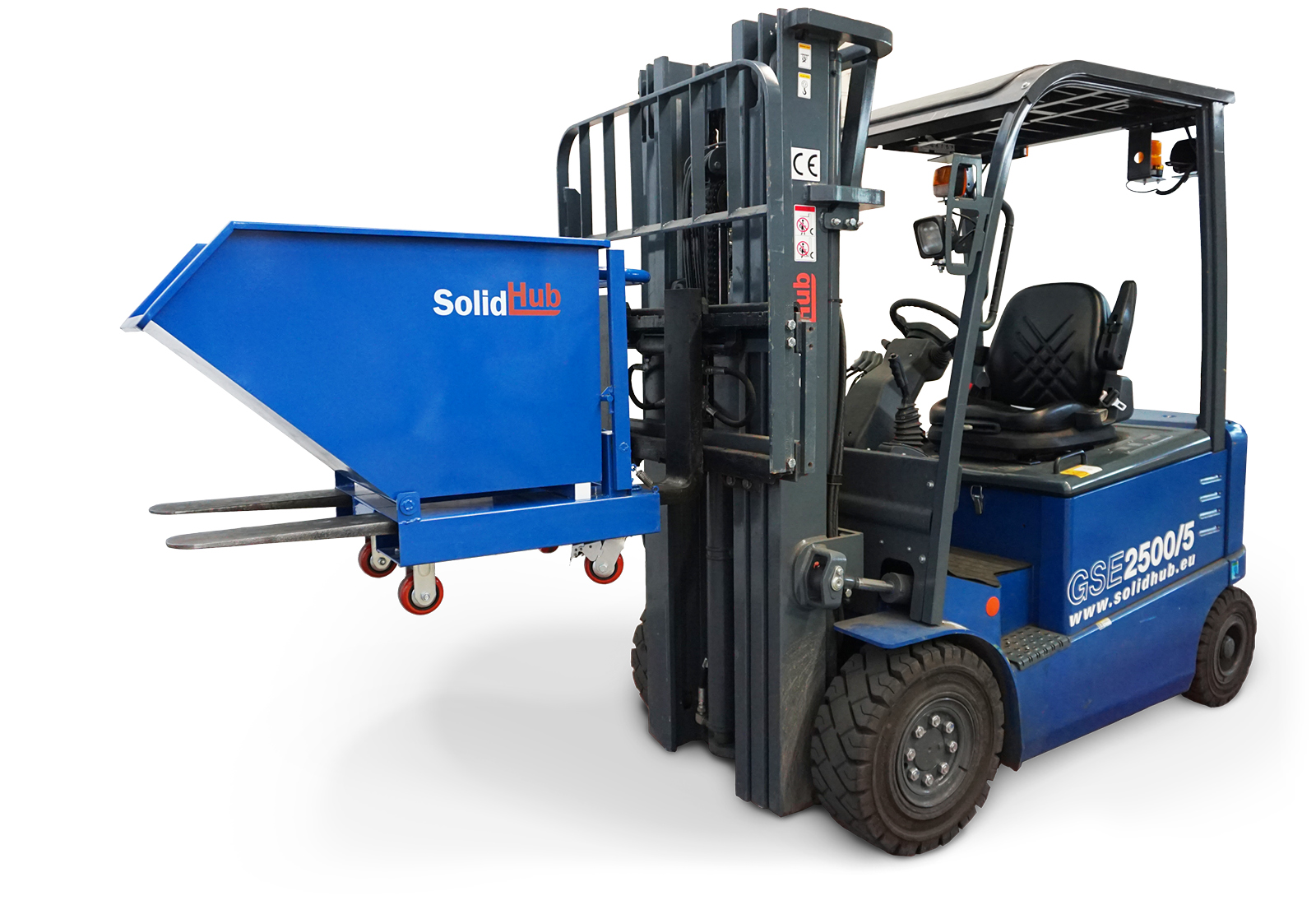 Emptying is carried out via the integrated tipping mechanism when the container is picked up on the forks of a suitable forklift truck. The snap-in device, which ensures that the container does not tip over during transport, can be unlocked at waist height. After being picked up with a suitable forklift truck, the tipping mechanism is activated via the release lever to empty the container in a controlled manner. Safety chains limit the tipping angle during emptying when the container is picked up.