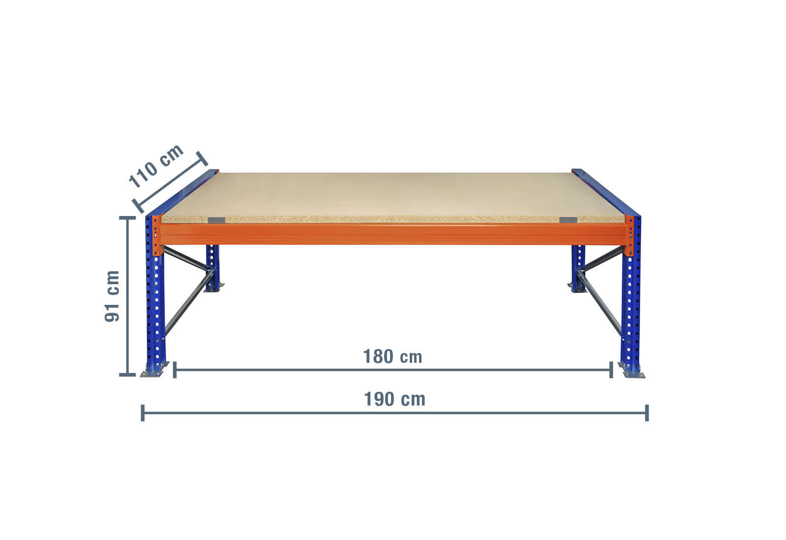 This packing table with dimensions of 1,9 m x 110 cm x 0,91 m is equipped with 1 pallet rack wooden boards made from chipboard. This allows dry goods to be stored and processed. The wooden board can be placed securely on the orange painted beams with the supplied Z-plates. This design prevents the shelf from slipping and falling out and ensures occupational safety. The individual levels can be attached at increments of 50 mm. The usable contact area of this packing table is 180 cm.