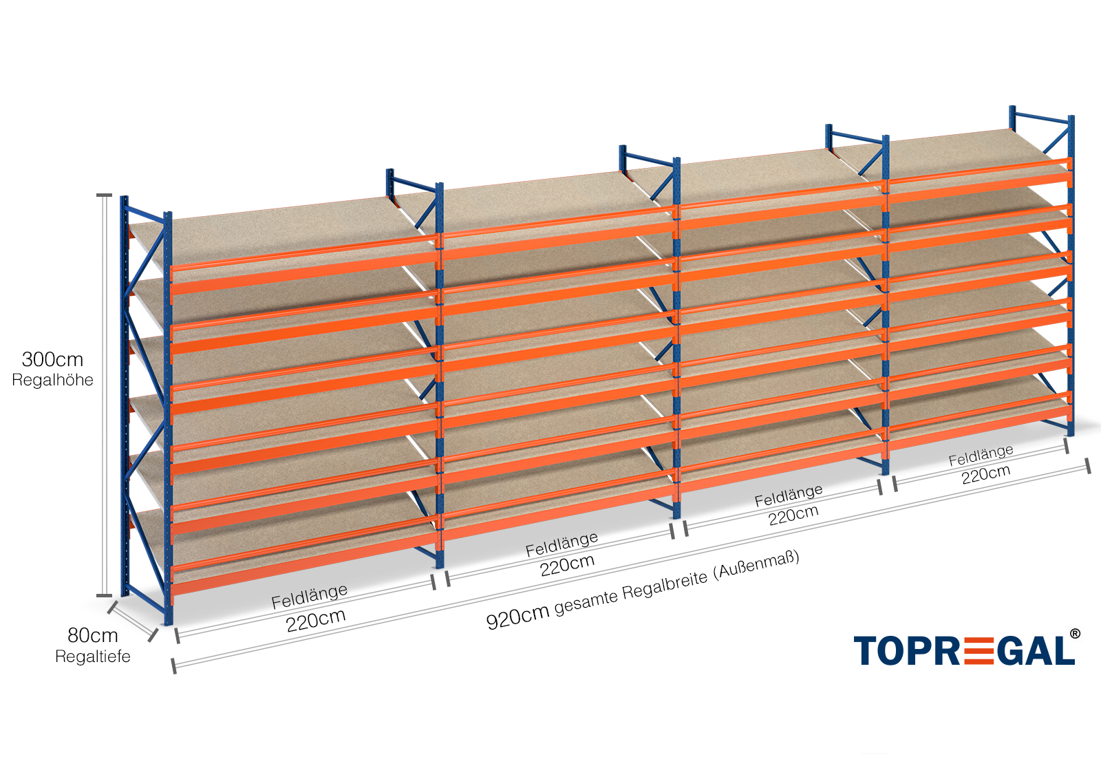 All data refer to evenly distributed loads. When loaded, the shelf load and field load must not be exceeded. In principle, the current guidelines on safety and health at work (german DGUV Rule 208-061) apply during use. TOPREGAL accepts no liability for accidents/damage caused by improper use. Our expert advisory team will be pleased to answer any questions you may have. Dimensions given are approximate and may deviate by a few centimetres. Contact us if you need the exact dimensions for your desired product.