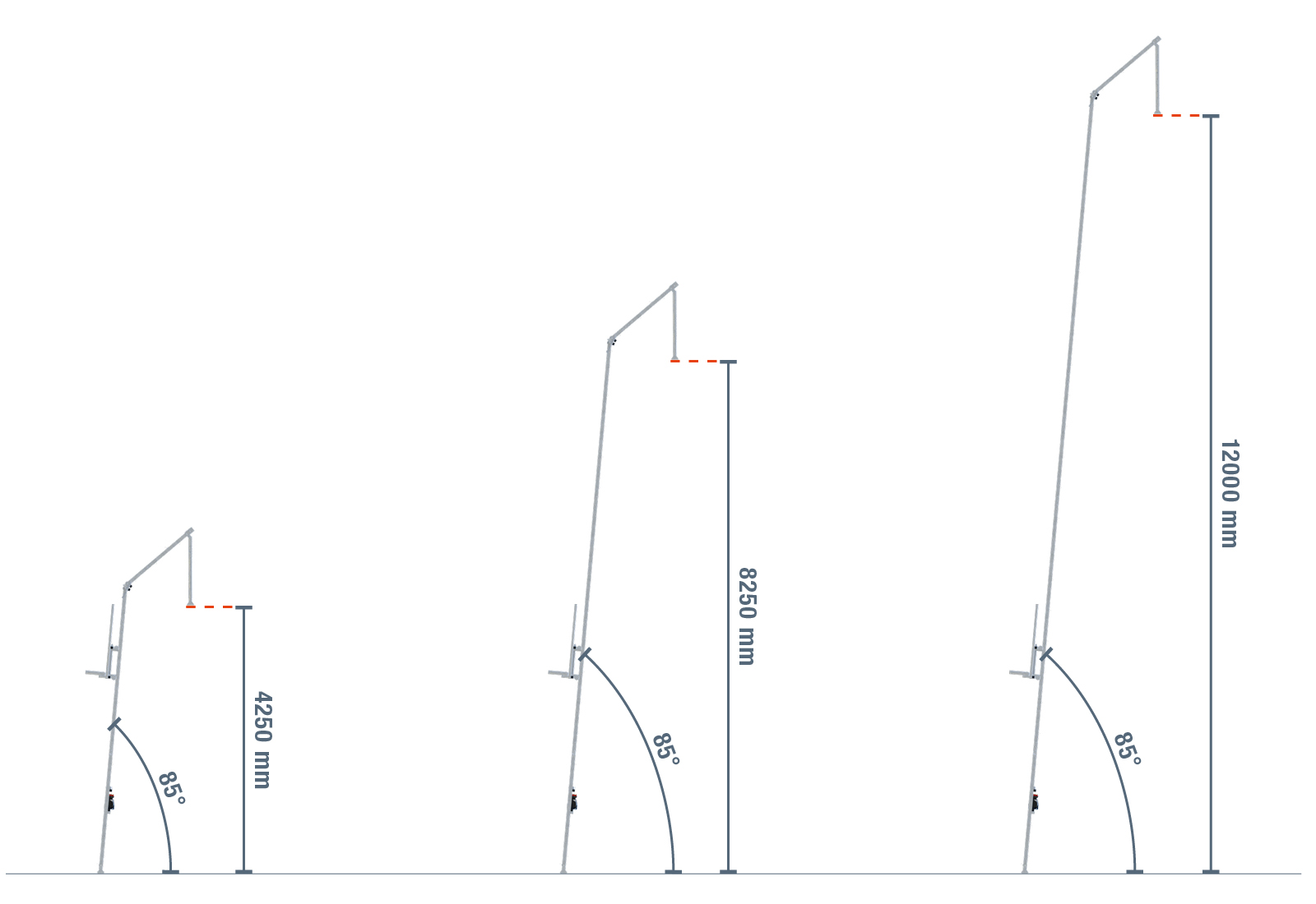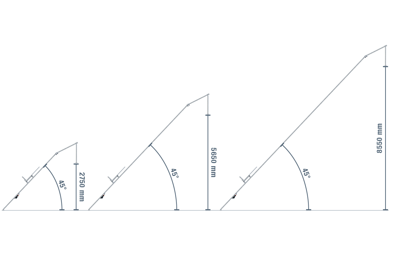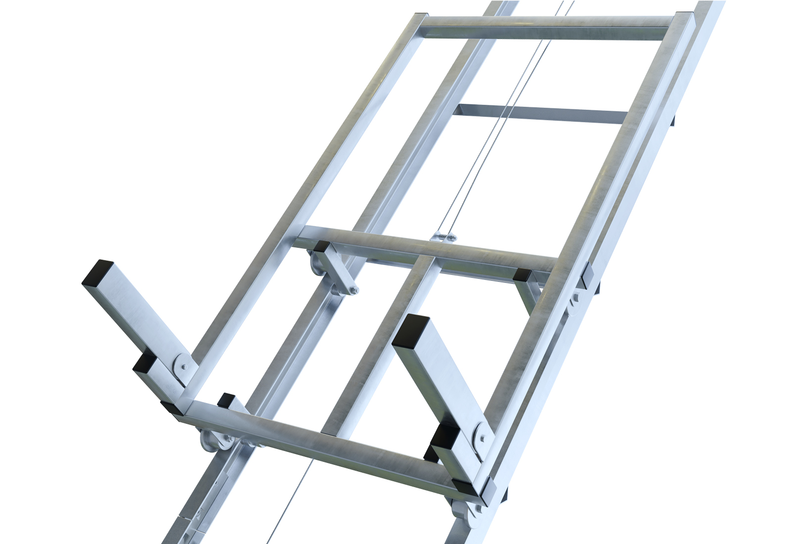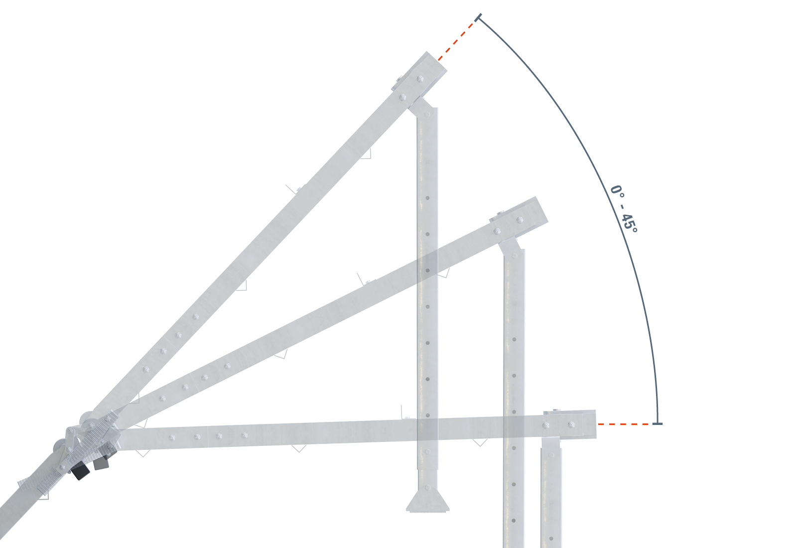 The roof load lift from SolidHub has a fully modular design, consisting of five robust rail modules, each 2.000 mm long, which are securely connected using screw-fastened connecting plates. An additional support bar ensures maximum stability. The integrated articulated joint at the upper end allows a variable angle of inclination of 20° - 40° and can thus be flexibly adapted to different roof pitches and locations. The entire system is supported by a base at the lower end, which is self-securing thanks to its intelligent design.
