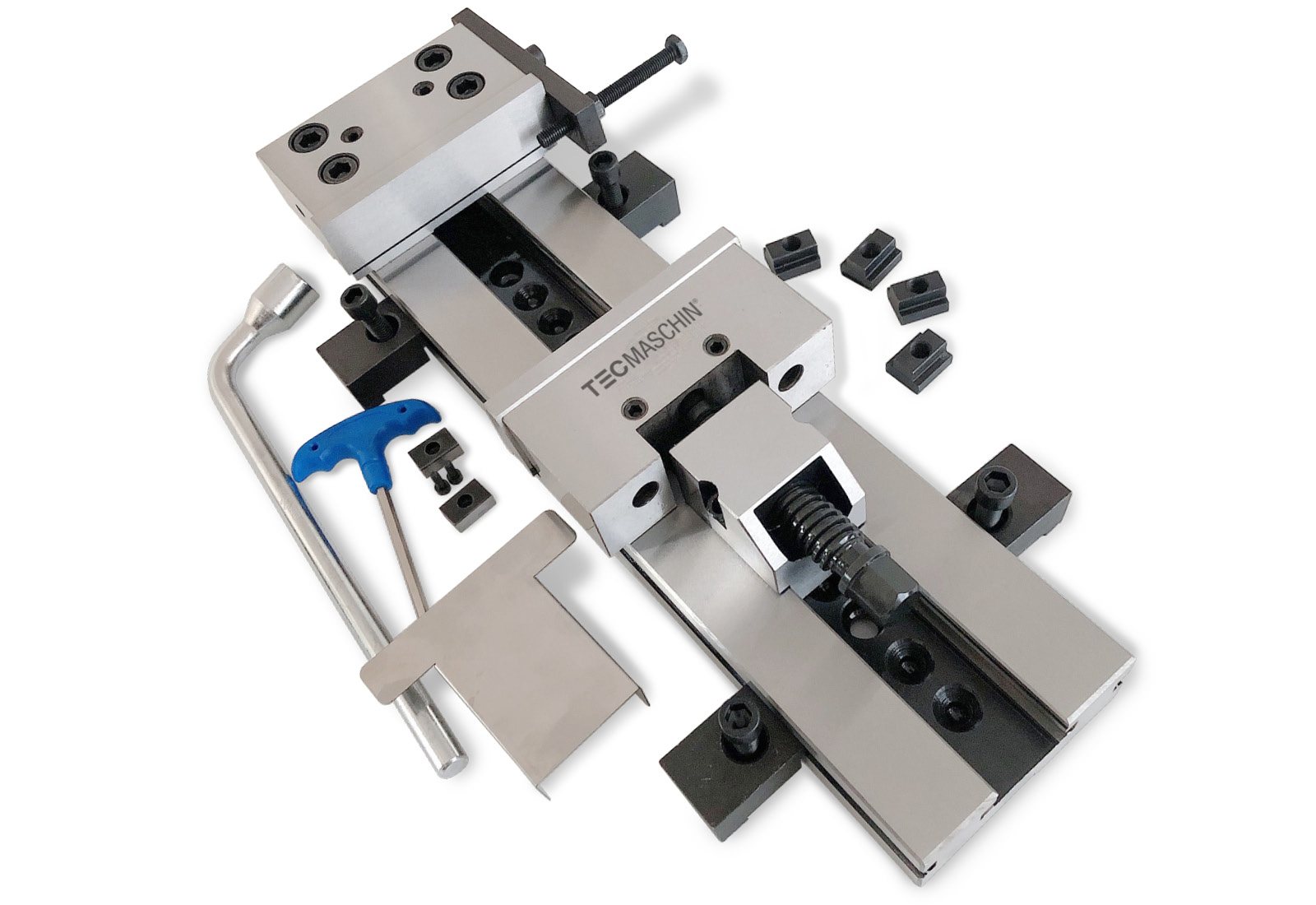 The MA-S200 machine vice from TecMaschin meets the highest standards for precision, even under heavy strain. It holds the workpiece firmly in place and keeps it from slipping even during machining work such as milling or drilling with a tolerance of 0,05 mm. This is made possible by the vice’s integrated pull-down system. The machine vice, with its compact dimensions of 150 mm x 420 mm x 100 mm, can be attached to CNC machines, workbenches, machining centres and other machine tools by means of clamping jaws/clamping claws. The vice can be easily adjusted and workpieces firmly clamped in place with the enclosed hex key.