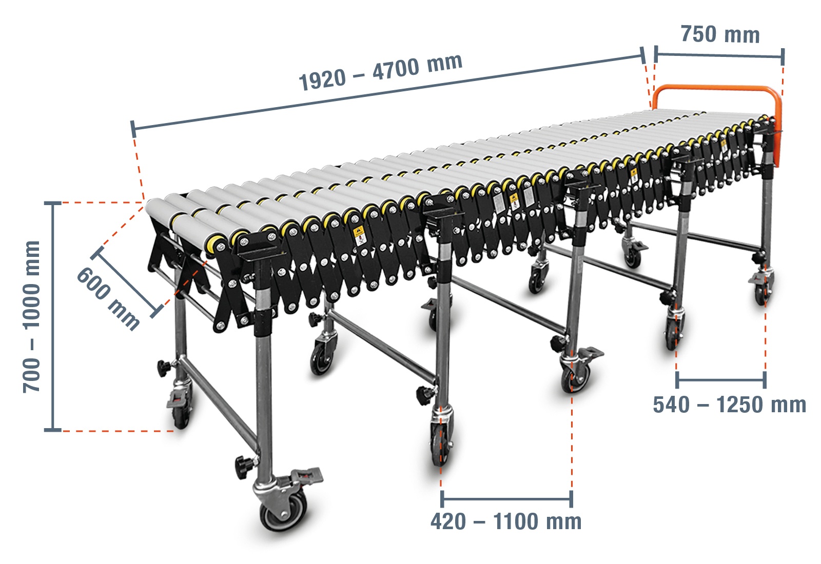 Thanks to the height-adjustable feet (700 - 1.000 mm), the inclination of the roller conveyor can be adjusted quickly and easily, enabling parcels to be transported even on sloping or stepped surfaces. This also facilitates the unloading and loading of transport vehicles, as differences in height can be easily overcome. In addition, handling is particularly uncomplicated and flexible thanks to the small dimensions (1.920 - 4.700 mm x 750 mm x 700 mm) when pushed together and the swivel castors and brakes. The retractable handle at one end of the roller track further simplifies handling. The castors made of durable ABS are particularly light compared to steel castors, which means that the roller track only weighs 97 kg. The FRB-P5 can be loaded with a maximum of 40 kg/m².