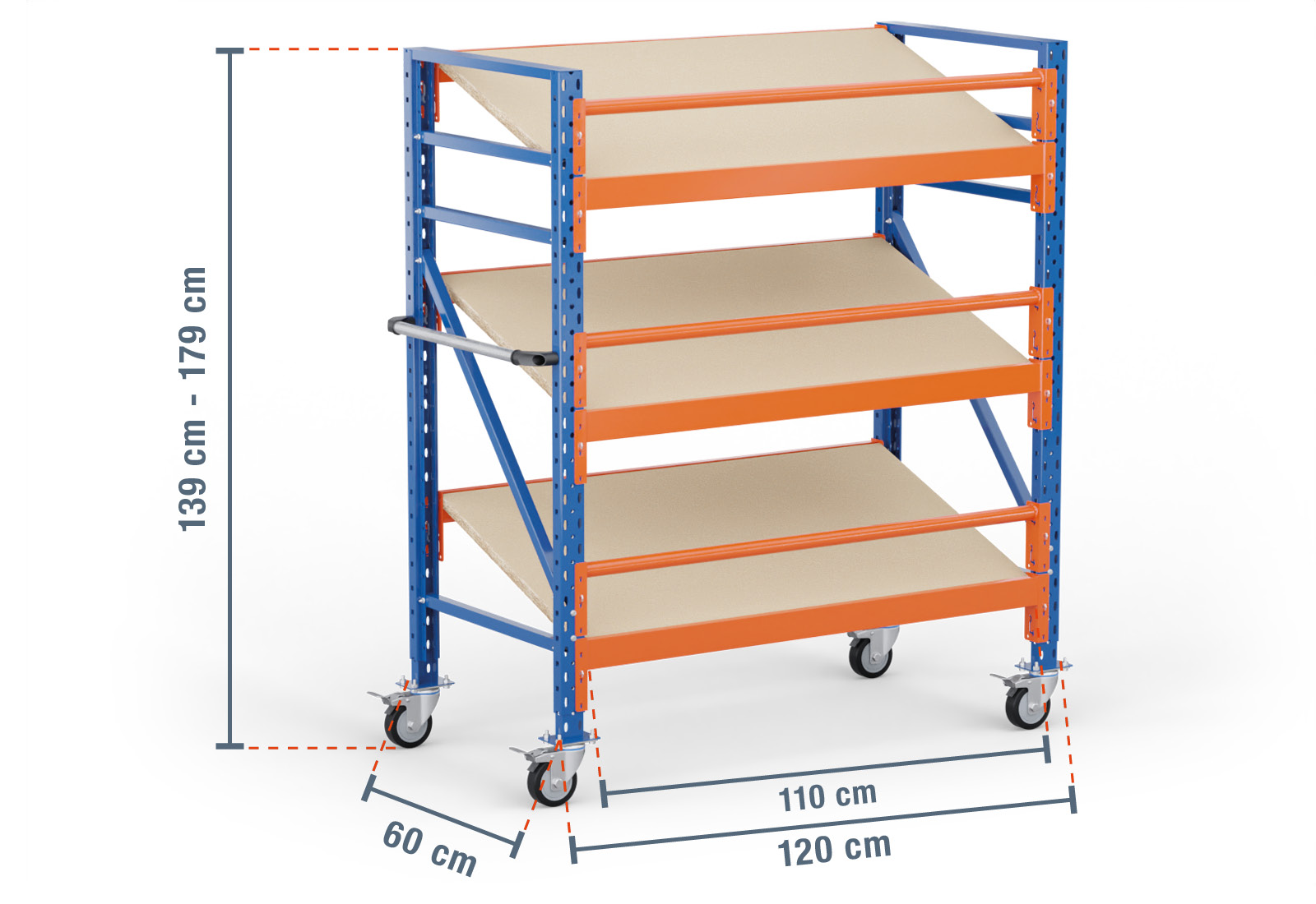 1,2 m mobile worktable kanban rack SR1500 / 60 cm deep / 1.390 - 1.790 mm high / 3 levels / rack layer Wood