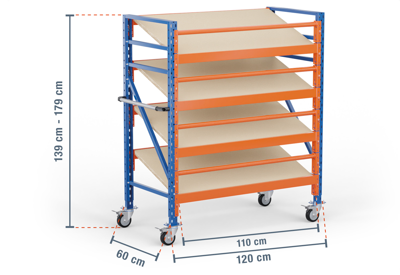 This mobile kanban rack from TOPREGAL comprises 4 levels, each of which is equipped with an angled wooden shelf. One level also has two stepped beams, which are the actual load-bearing elements, and a round beam used as fall protection. These beams are painted in orange and can be attached at individual increments of 50 mm. This improves the ergonomics of your rack and allows you to configure your compartments to be an optimal size.