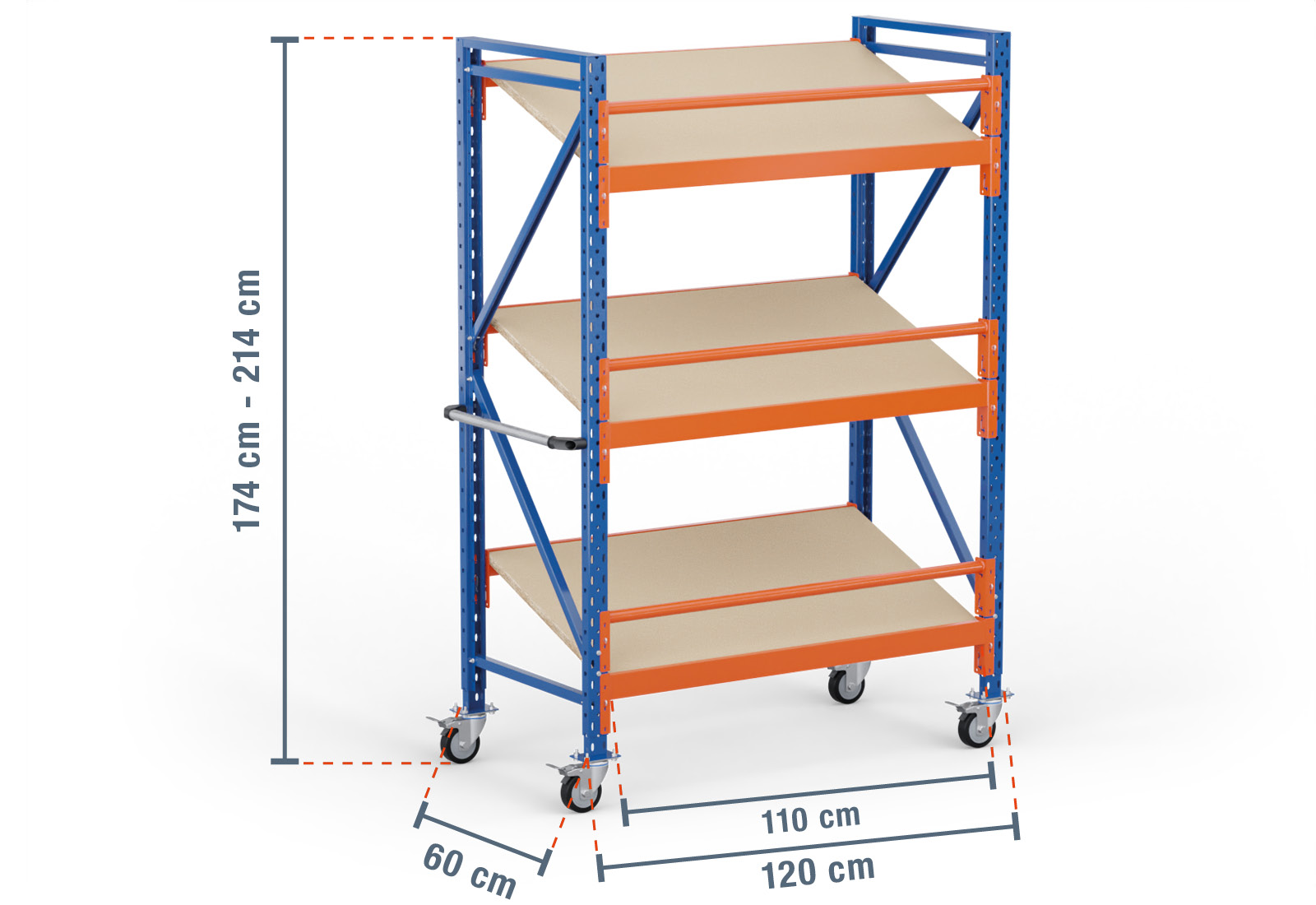 The mobile rack uprights each comprise two blue painted upright profiles. The two mobile castors with locking brake provide the necessary flexibility. Matching panels are connected to the upright profiles to improve occupational safety.