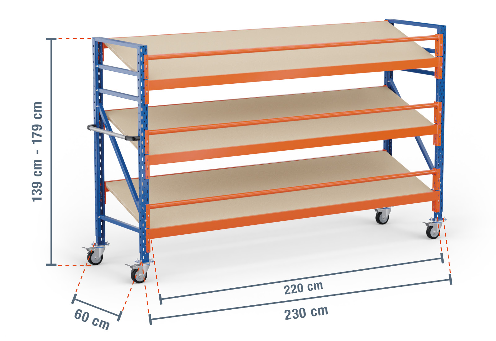 The outer dimension of this mobile kanban rack is 2,3 m, where the usable contact area, known as the inside dimension, is 10 cm shorter. The maximum load capacity of a shelf compartment is 300 kg and the unit load capacity (maximum load between two rack uprights with an even weight distribution) is 500 kg.