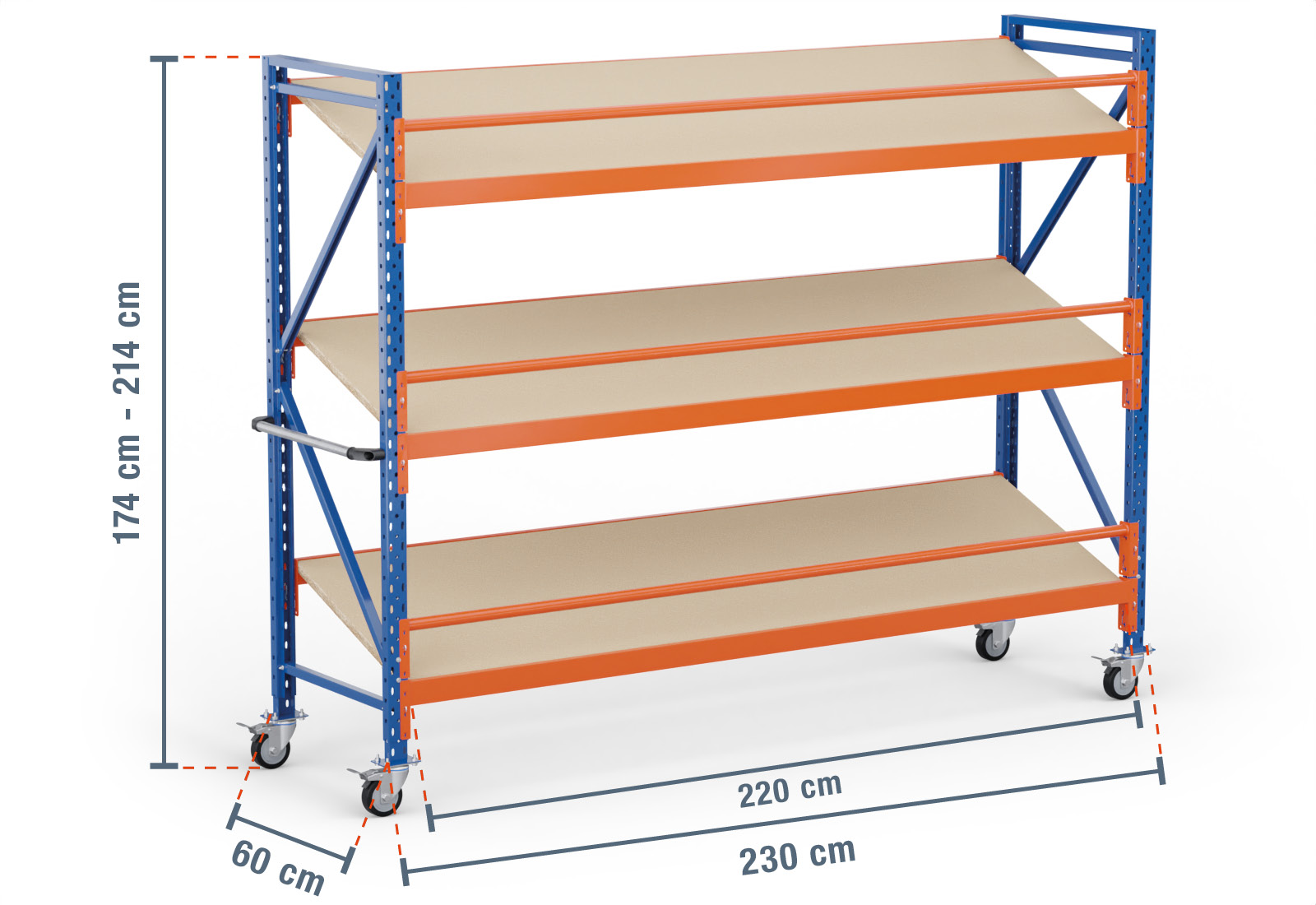 The outer dimension of this mobile kanban rack is 2,3 m, where the usable contact area, known as the inside dimension, is 10 cm shorter. The maximum load capacity of a shelf compartment is 300 kg and the unit load capacity (maximum load between two rack uprights with an even weight distribution) is 500 kg.