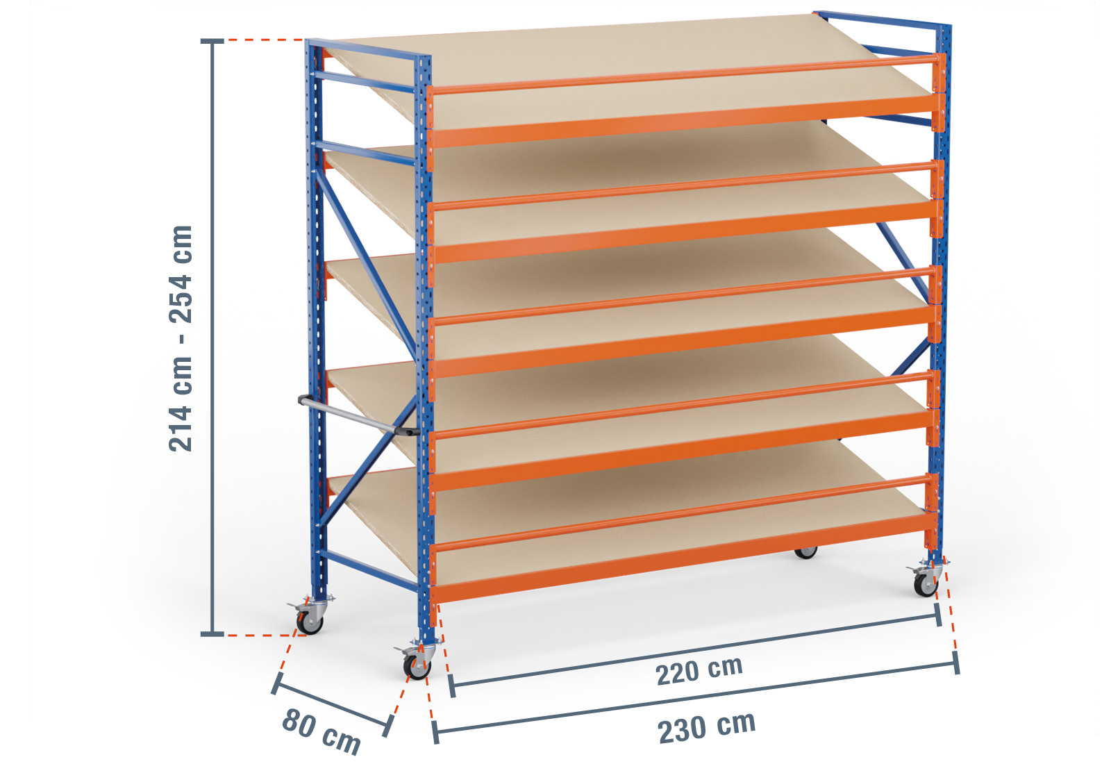 This mobile kanban rack from TOPREGAL comprises 5 levels, each of which is equipped with an angled wooden shelf. One level also has two stepped beams, which are the actual load-bearing elements, and a round beam used as fall protection. These beams are painted in orange and can be attached at individual increments of 50 mm. This improves the ergonomics of your rack and allows you to configure your compartments to be an optimal size.