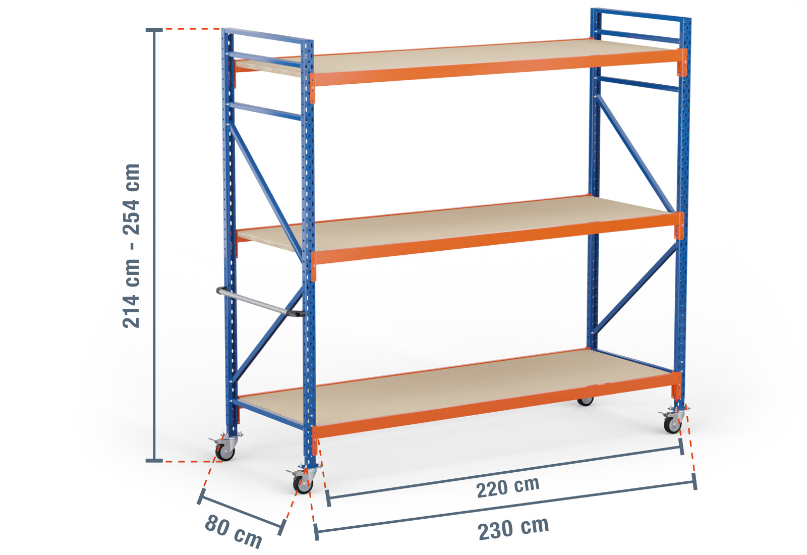 2,3 m mobile storage rack LR2000 / 80 cm deep / 2.140 - 2.540 mm high / 3 levels / rack layer Wood