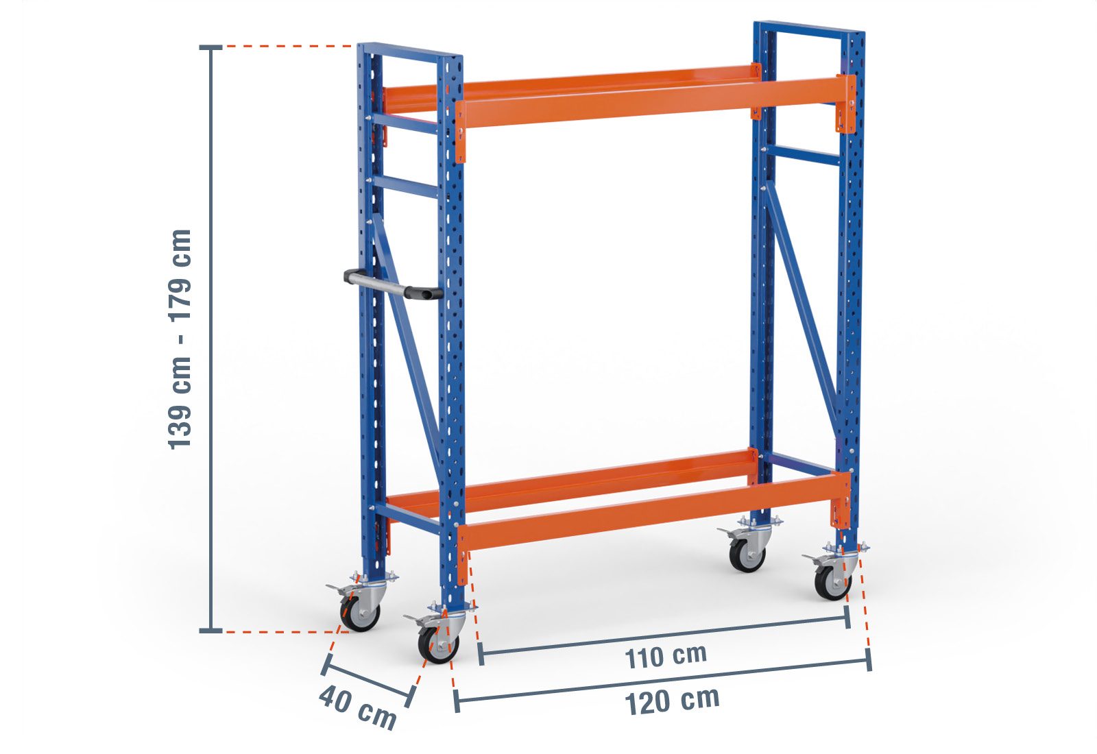 The working height of the mobile tyre rack can be adjusted in increments of 50 mm and ranges from 1.390 - 1.790 mm. Simply adjust the insertion height of the upright at the foot part. The complete rack is equipped with 4 castors with locking brakes and is therefore suitable for mobile use. This mobile rack is offered especially for commercial and industrial use and is also suitable for robust applications. Thanks to the modular design of our racks, they can be extended and adapted to your requirements at any time.