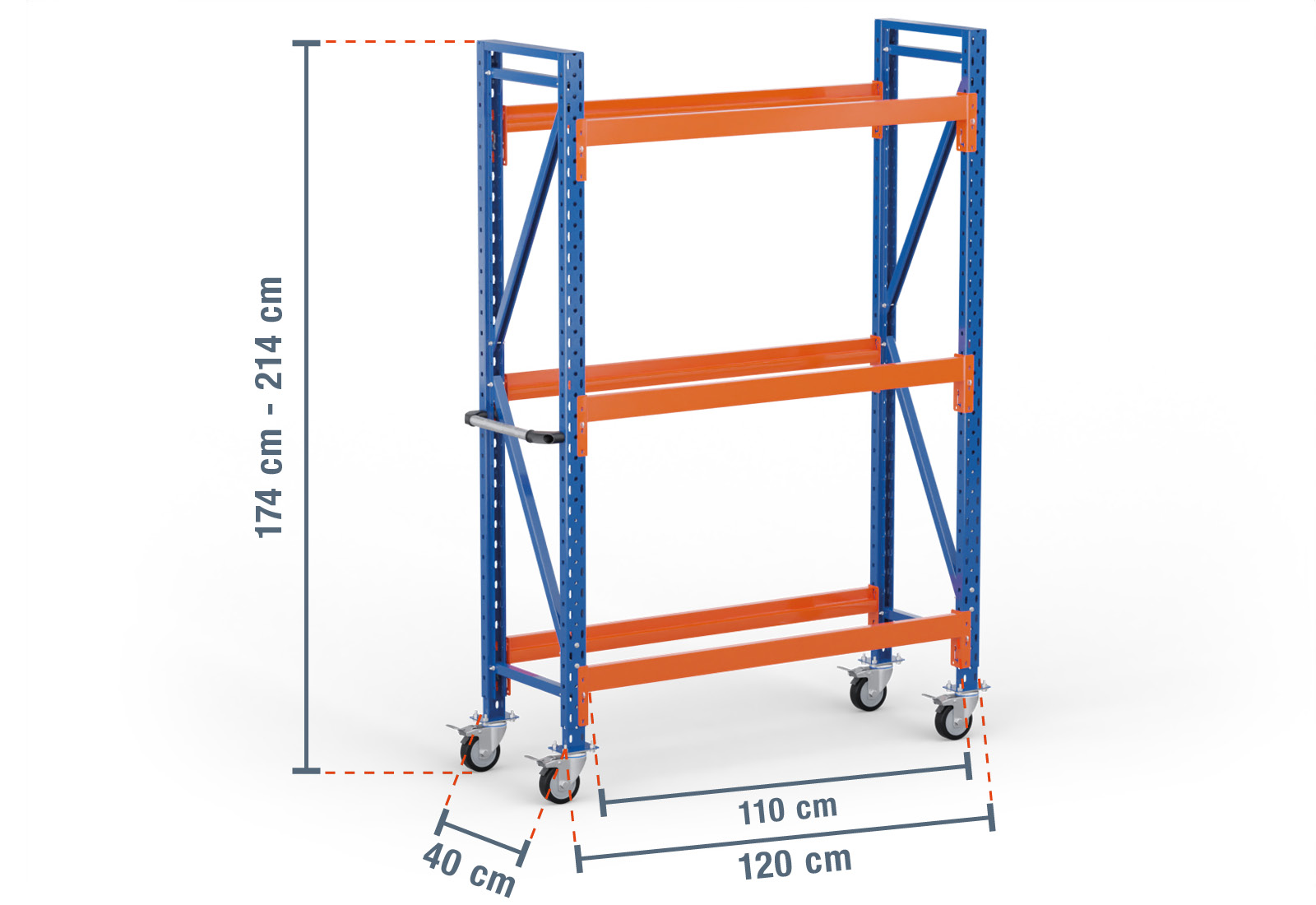 The working height of the mobile tyre rack can be adjusted in increments of 50 mm and ranges from 1.740 - 2.140 mm. Simply adjust the insertion height of the upright at the foot part. The complete rack is equipped with 4 castors with locking brakes and is therefore suitable for mobile use. This mobile rack is offered especially for commercial and industrial use and is also suitable for robust applications. Thanks to the modular design of our racks, they can be extended and adapted to your requirements at any time.