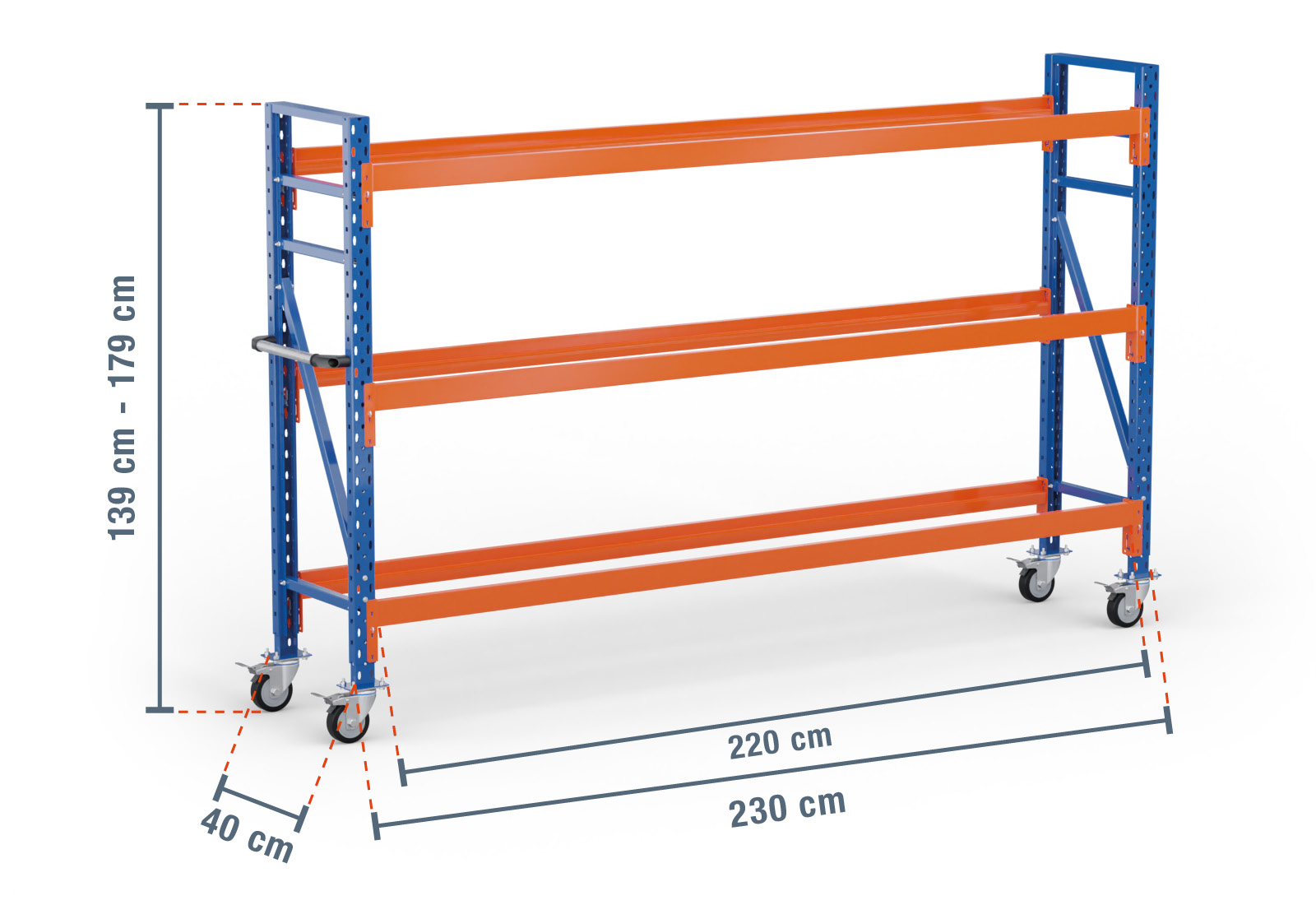2,3 m mobile tyre rack RR2000 / 40 cm deep / 1.390 - 1.790 mm high / 3 levels