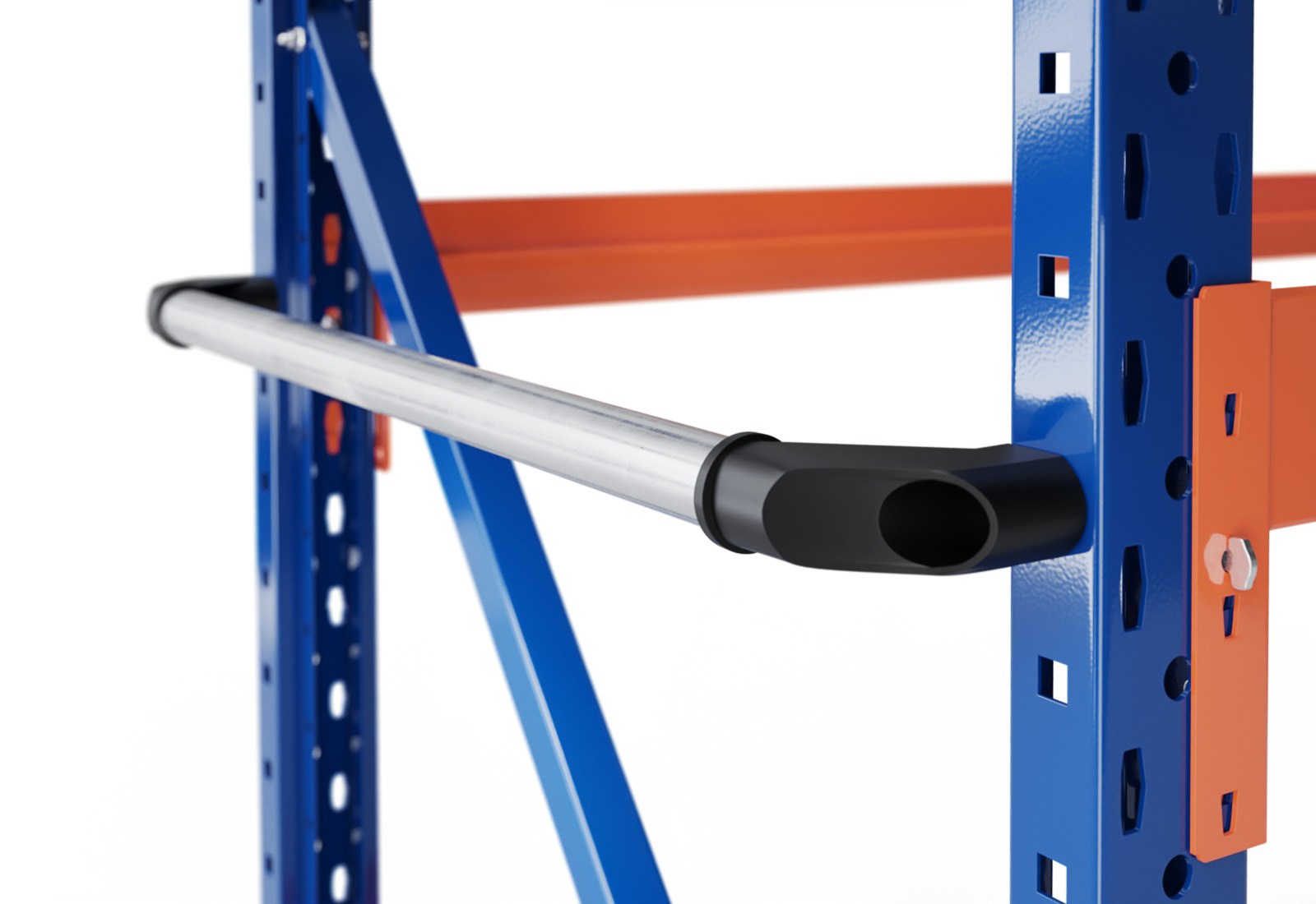 The beams (powder-coated in orange) are easily attached to the uprights and secured using safety pins to prevent them accidentally being lifted out. The height of the beams can be adjusted individually in increments of 50 mm. The tyres are placed onto the beams and can be stored safely, protecting them from damage thanks to the special design of the stepped beam.
