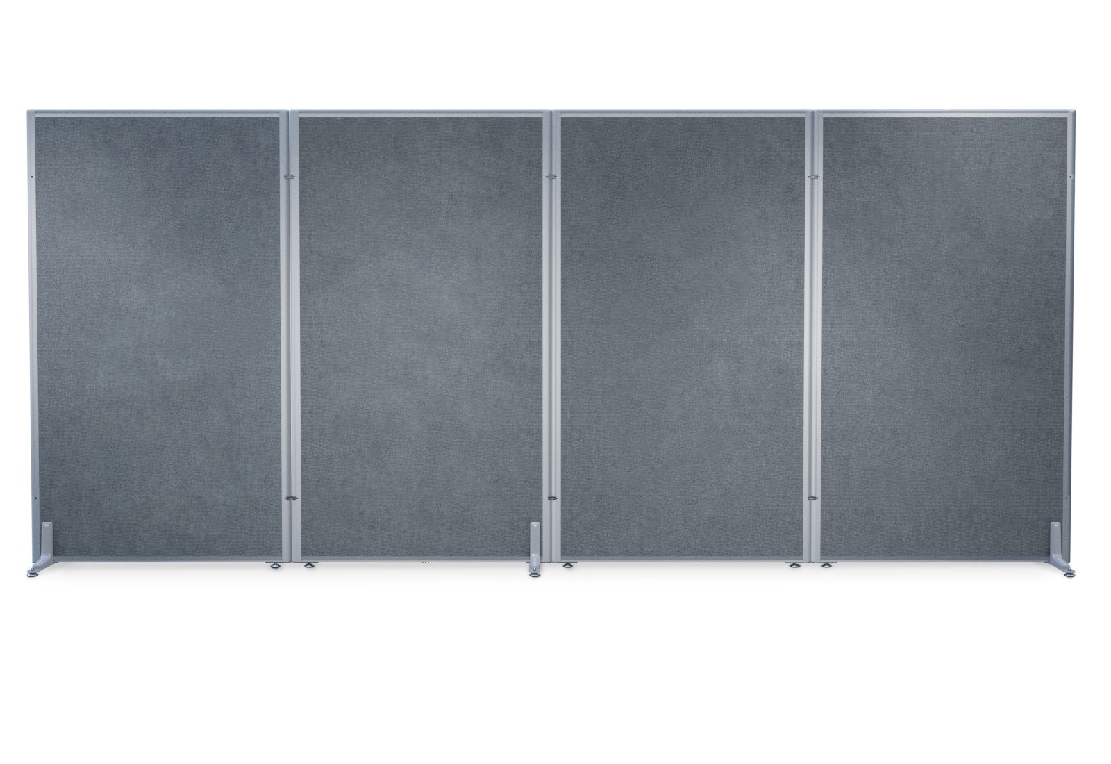 - The partition wall system is made of robust wood particle board with a high-quality, double-sided fabric cover (grey mottled) in a decorative aluminium frame.