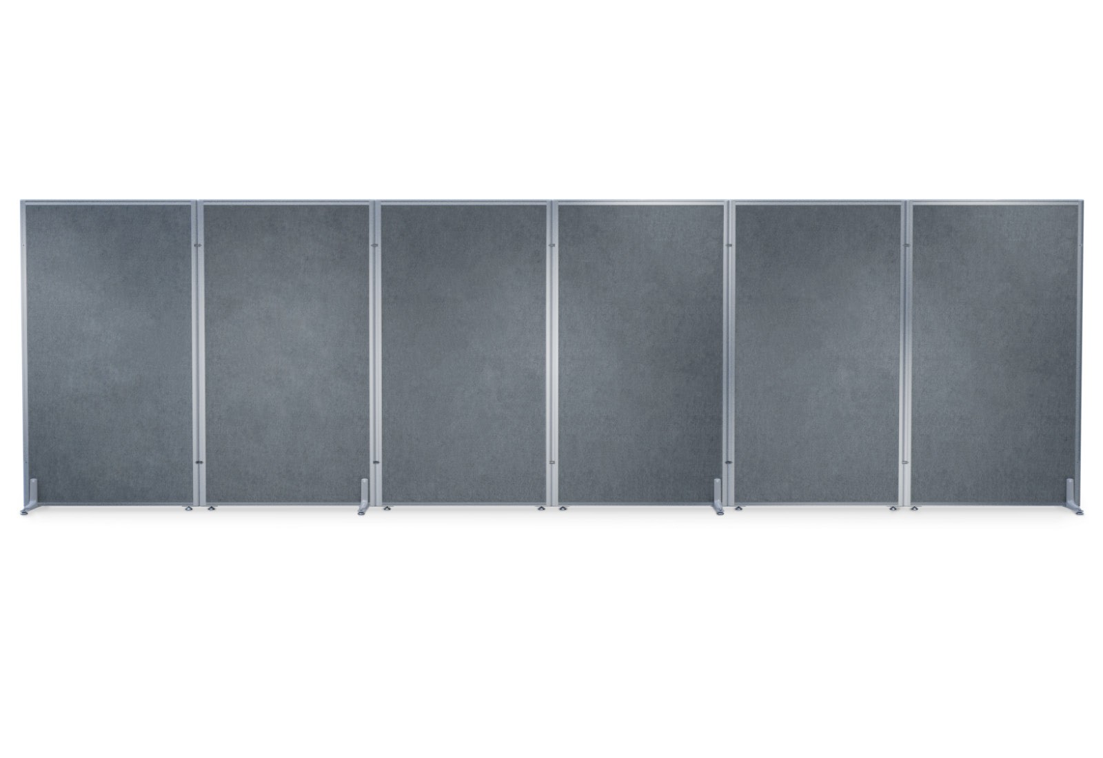 - The partition wall system is made of robust wood particle board with a high-quality, double-sided fabric cover (grey mottled) in a decorative aluminium frame.