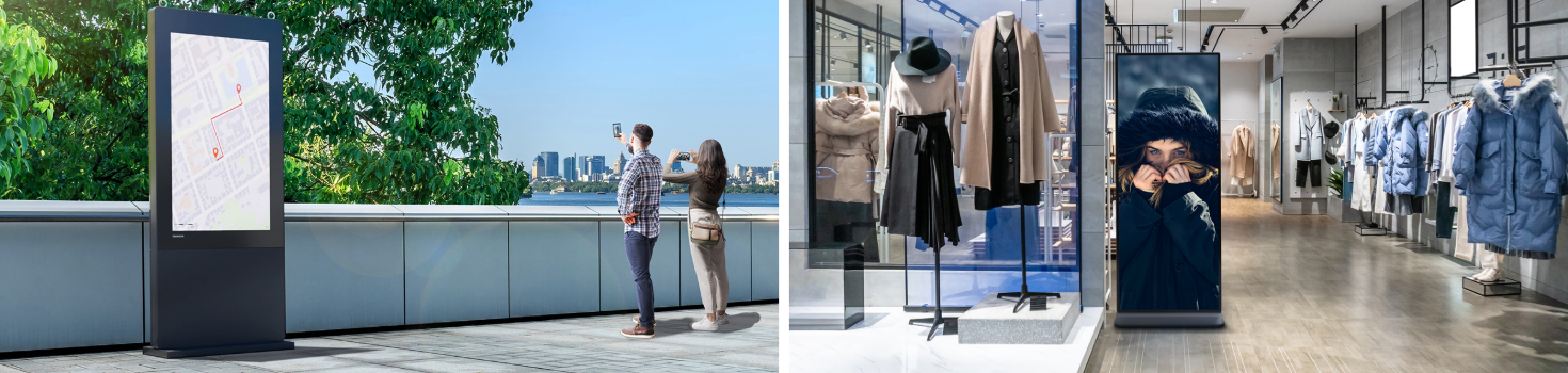 Out-of-home advertising visually advertises targeted services, products or offers. However, it is also fast-moving and needs to be replaced regularly. This often demands more work and time from the staff on site and sometimes limits the creativity of marketing campaigns. To meet the need for constant topicality, digital advertising screens such as the DKS-LED65 can instantly play video, audio and image files via interfaces such as USB, HDMI, Wi-Fi and Bluetooth. Moving advertising combined with sound attracts more attention than pure billposting. With the intuitive Android 11 system, every employee is able to play content, access websites and download apps.