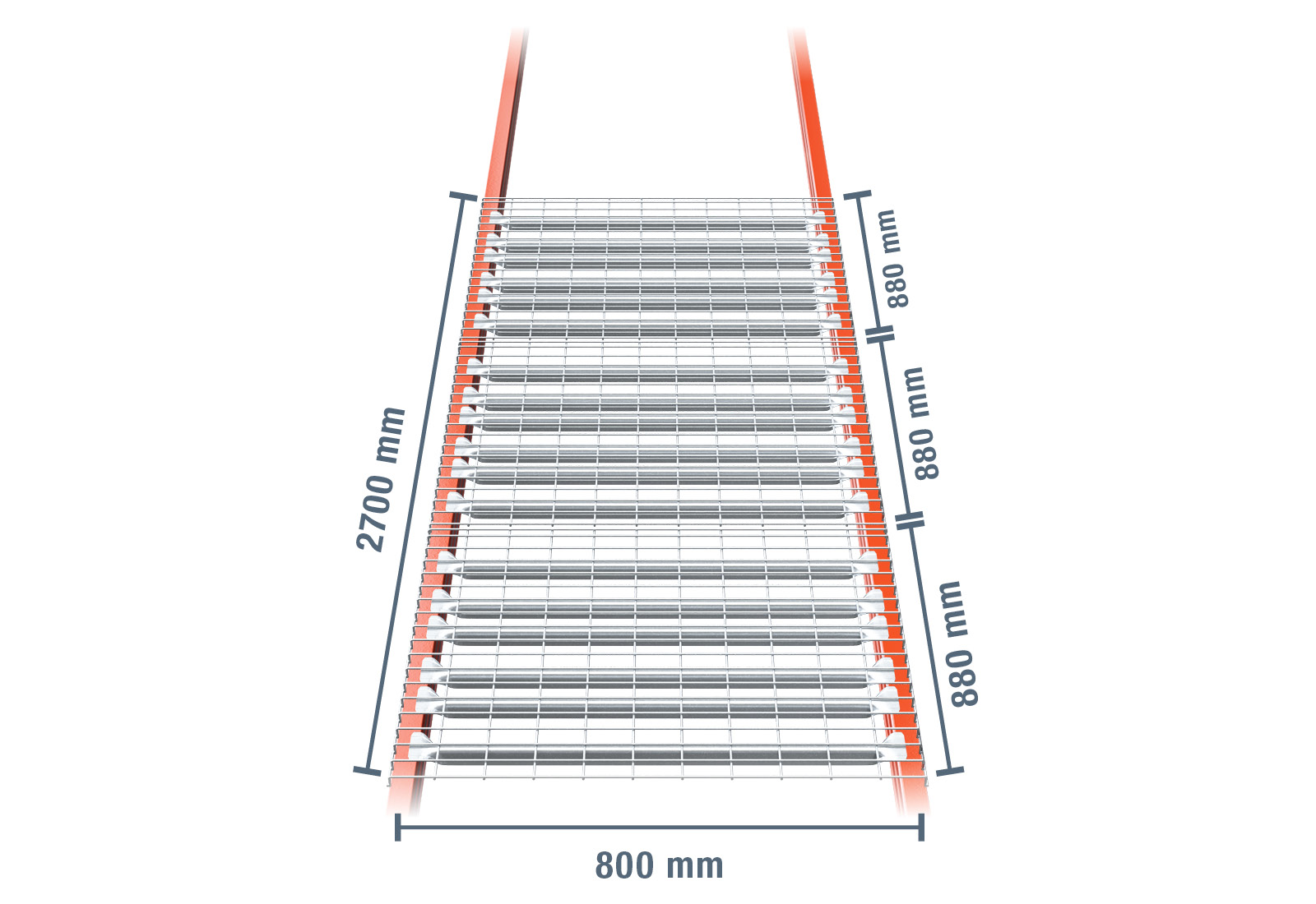 This wire mesh shelf comprises 3 wire mesh modules with a depth of 800 mm and a width of 880 mm. This creates a total width of 270 cm. The maximum load-bearing capacity of this wire mesh with an even load distribution is 4.500 kg. When loading your pallet rack, please observe the maximum compartment and unit load capacities specified for the PR15000. For outdoor use, we recommend the rack mesh shelf in galvanised steel.