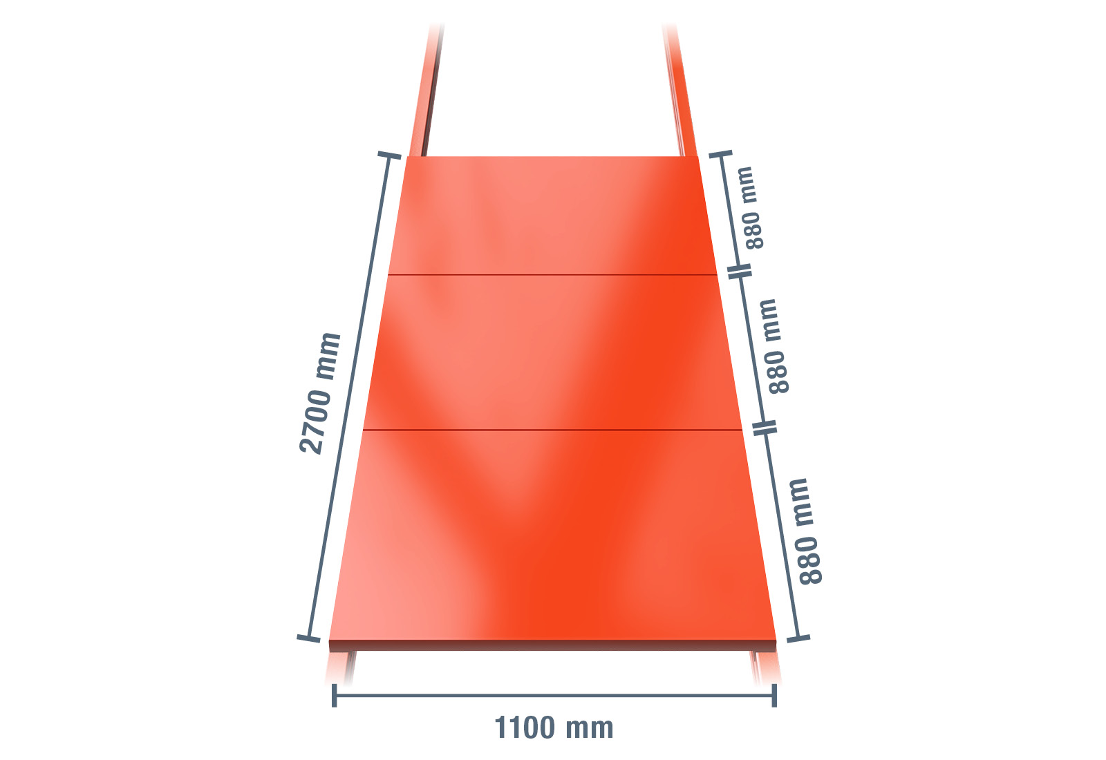 The steel shelf for the pallet rack comprises 3 modules with a depth of 1.100 mm and a width of 885 mm. The total width is therefore 2.700 mm. Each module has a maximum load capacity of 1.000 kg.