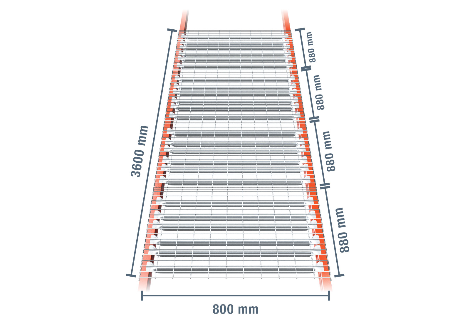 This wire mesh shelf comprises 4 wire mesh modules with a depth of 800 mm and a width of 880 mm. This creates a total width of 360 cm. The maximum load-bearing capacity of this wire mesh with an even load distribution is 4.000 kg. When loading your pallet rack, please observe the maximum compartment and unit load capacities specified for the PR15000. For outdoor use, we recommend the rack mesh shelf in galvanised steel.
