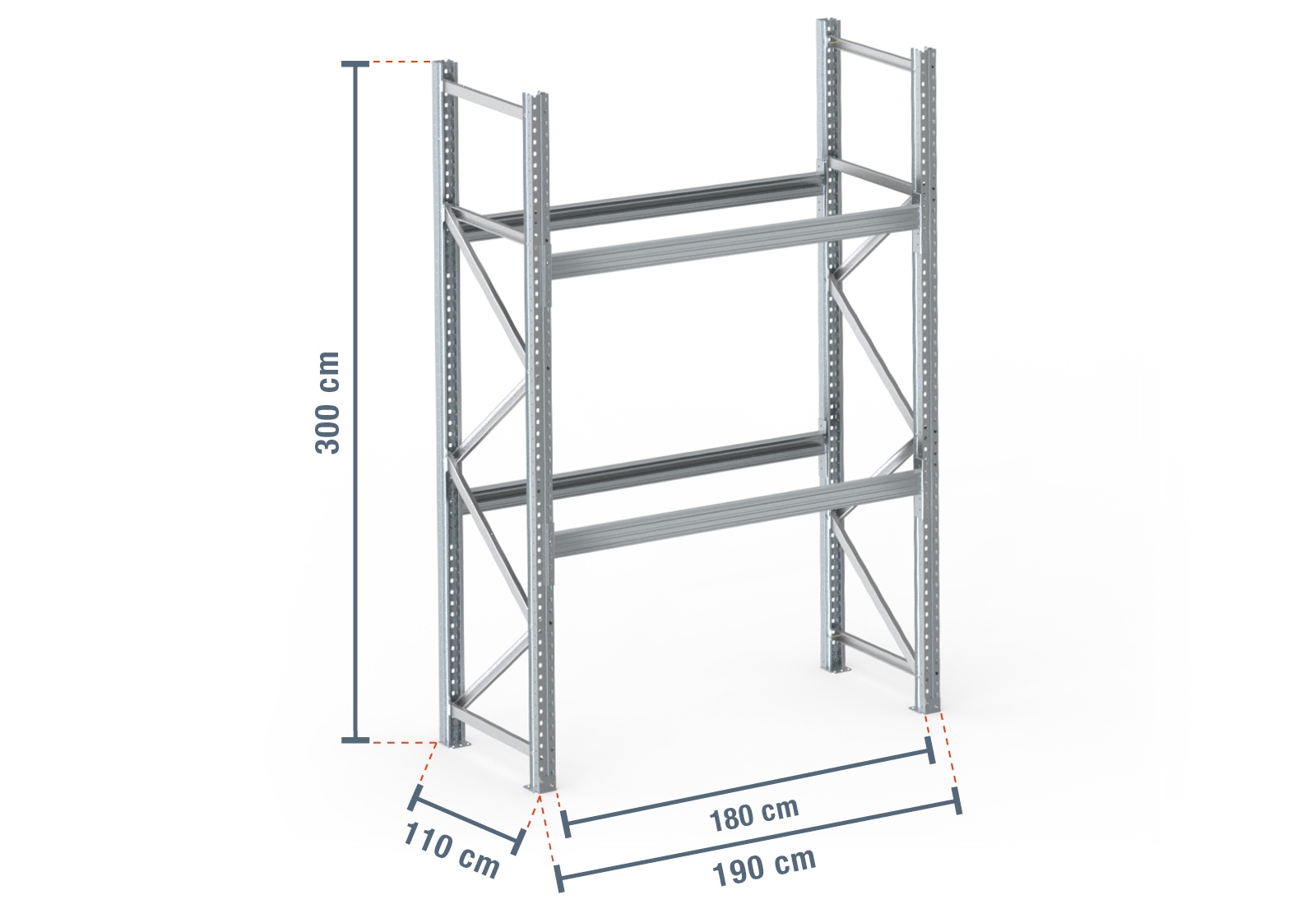 1,9 m pallet rack PR9000F galvanised / 110 cm deep / 3 m high / 2 levels for 6 euro pallets