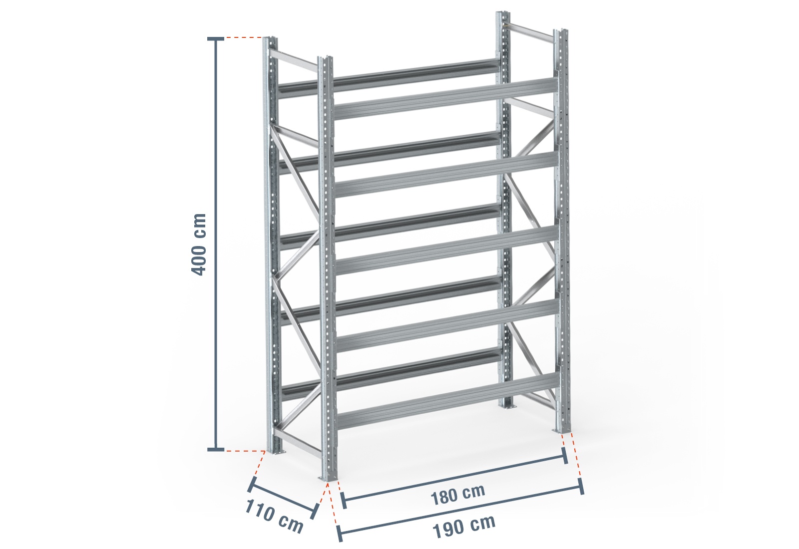 1,9 m pallet rack PR9000F galvanised / 110 cm deep / 4 m high / 5 levels for 12 euro pallets
