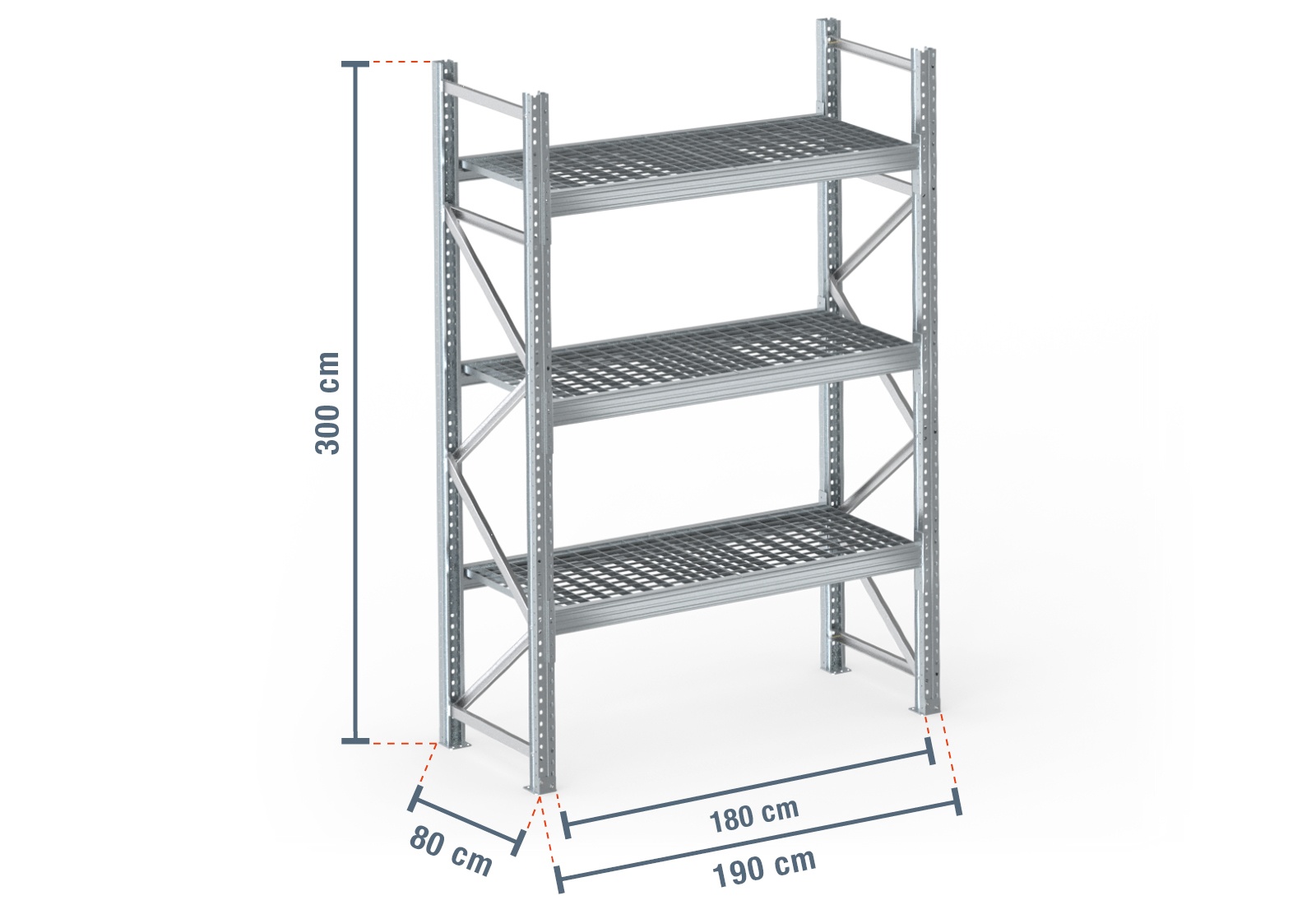 1,9 m pallet rack PR9000F galvanised / 80 cm deep / 3 m high / 3 levels / rack layer Galvanised mesh