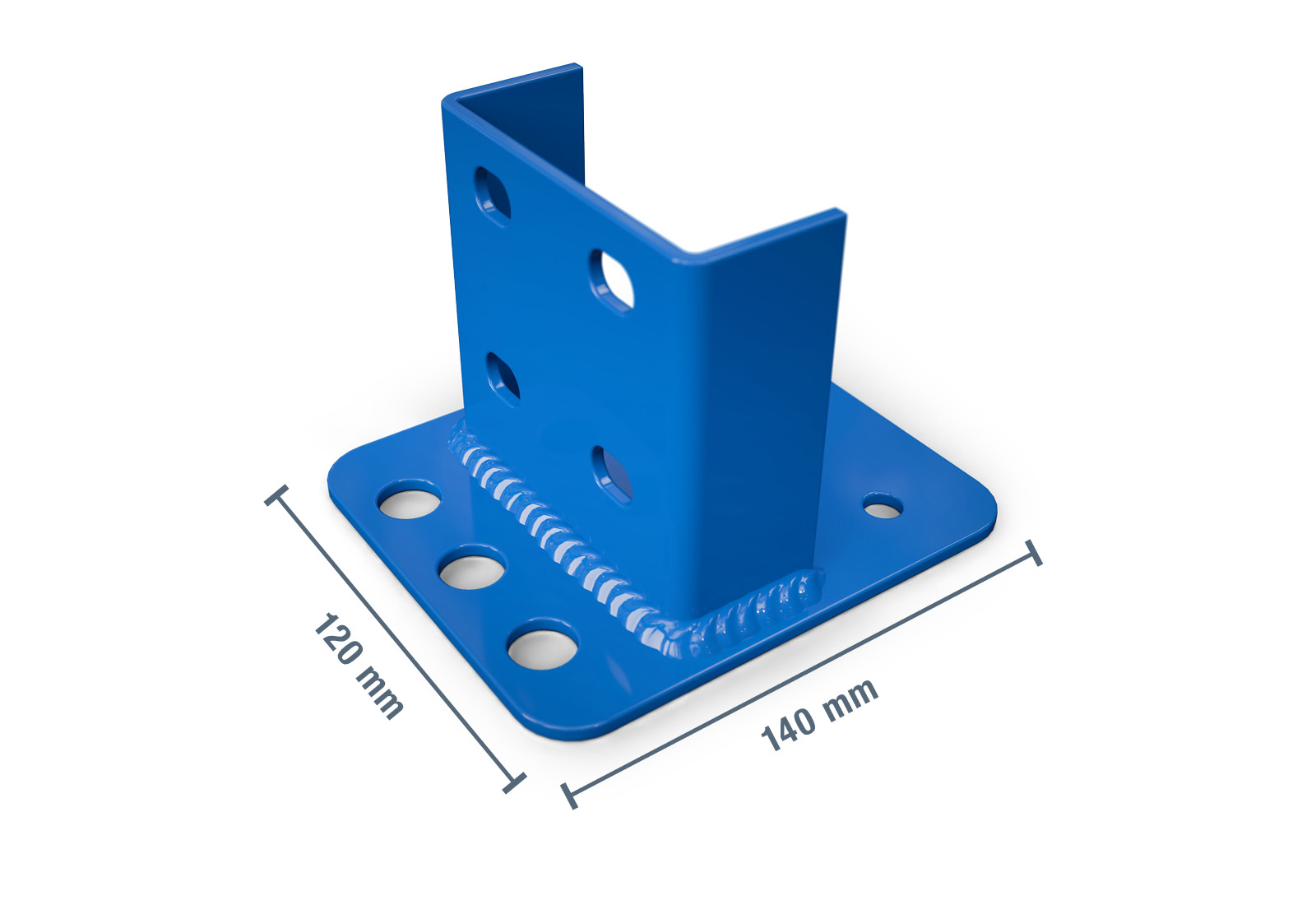 The beams are powder-coated in bright orange for safety in the workplace. They are simply attached to the rack uprights thanks to the plug-in design. Additional safety pins ensure safety by preventing the beam from being accidentally lifted out. The pallet rack uprights are made from two powder-coated upright profiles in blue. The front and rear upright profiles are screwed together with cross struts and diagonal struts for extra stability. For additional security, 2 foot plates per rack upright are mounted at the bottom ends and secured to the floor using bolt anchors. This means our modular pallet racking can be customised while also being highly secure as it is fixed to the floor.