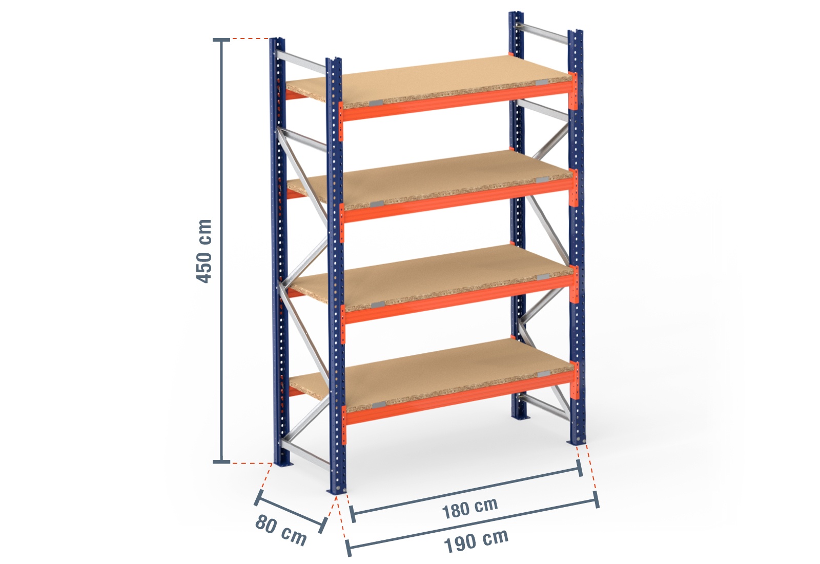 1,9 m pallet racking PR4500 / 80 cm deep / 4,5 m high / 4 levels / rack layer Wood