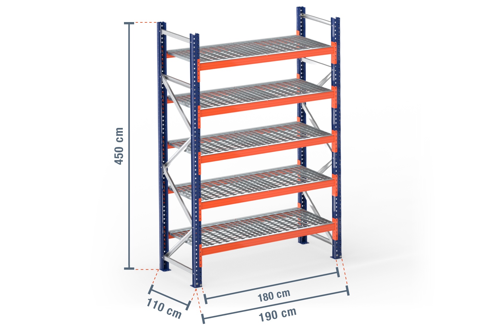 1,9 m pallet racking PR9000 / 110 cm deep / 4,5 m high / 5 levels / rack layer Galvanised mesh