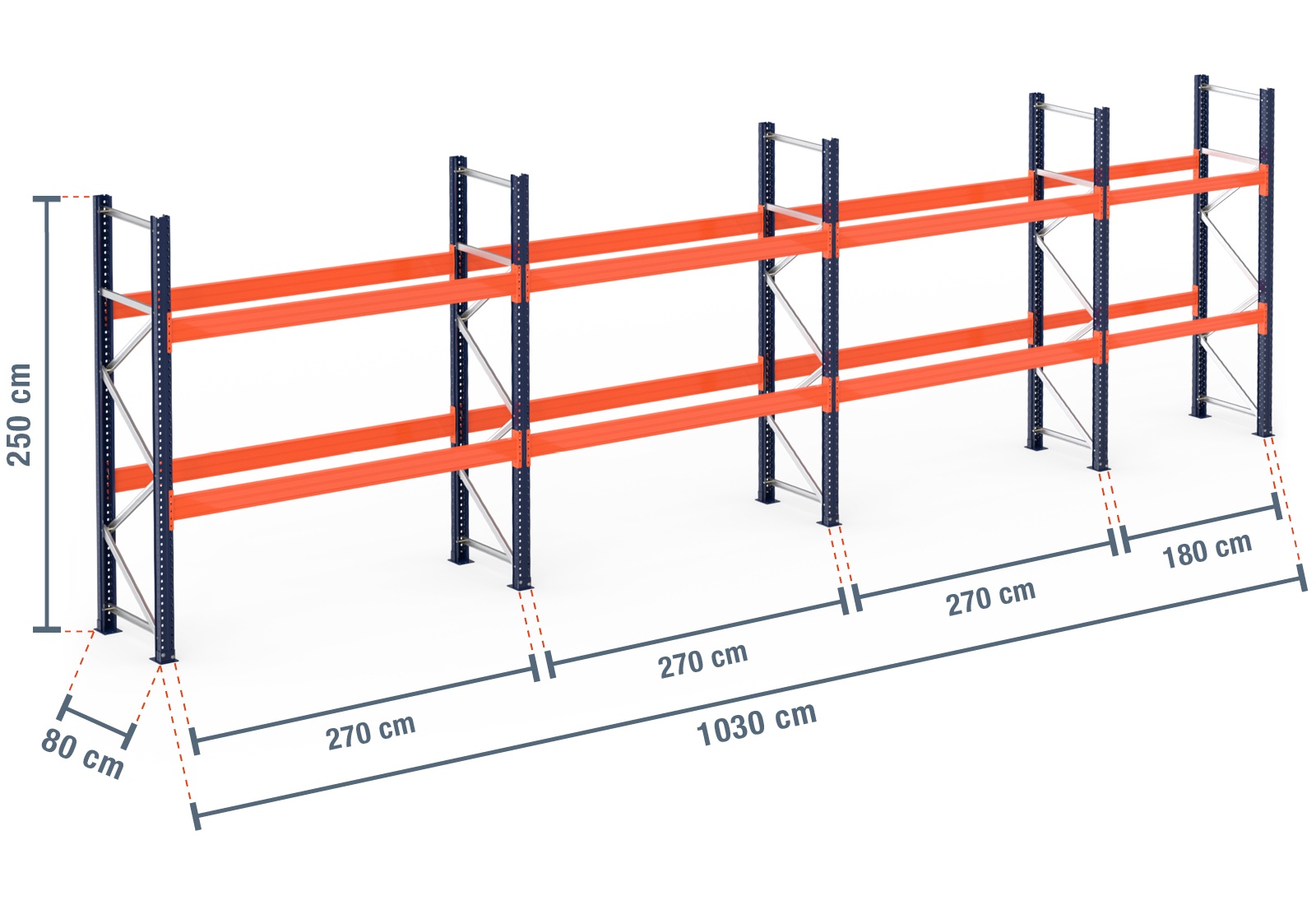 10,3 m pallet rack PR15000 / 80 cm deep / 2,5 m high / 2 levels for 33 euro pallets