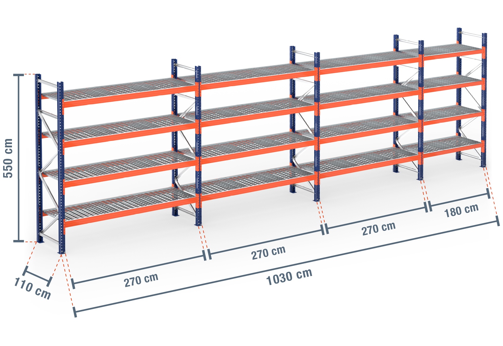 10,3 m pallet rack PR4500 / 110 cm deep / 5,5 m high / 4 levels / shelf Galvanised mesh