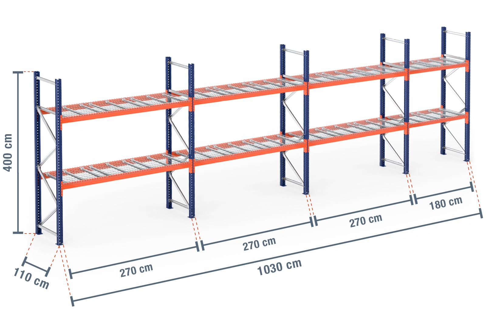 10,3 m pallet racking PR4500 / 110 cm deep / 4 m high / 2 levels / rack layer Wire mesh