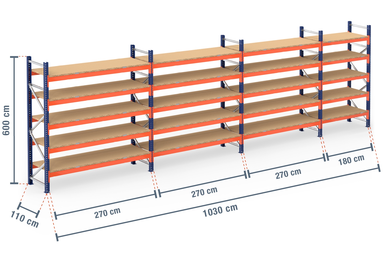 10,3 m pallet racking PR4500 / 110 cm deep / 6 m high / 5 levels / rack layer Wood