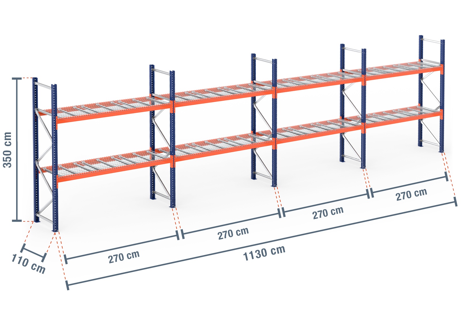 11,3 m pallet racking PR4500 / 110 cm deep / 3,5 m high / 2 levels / rack layer Wire mesh