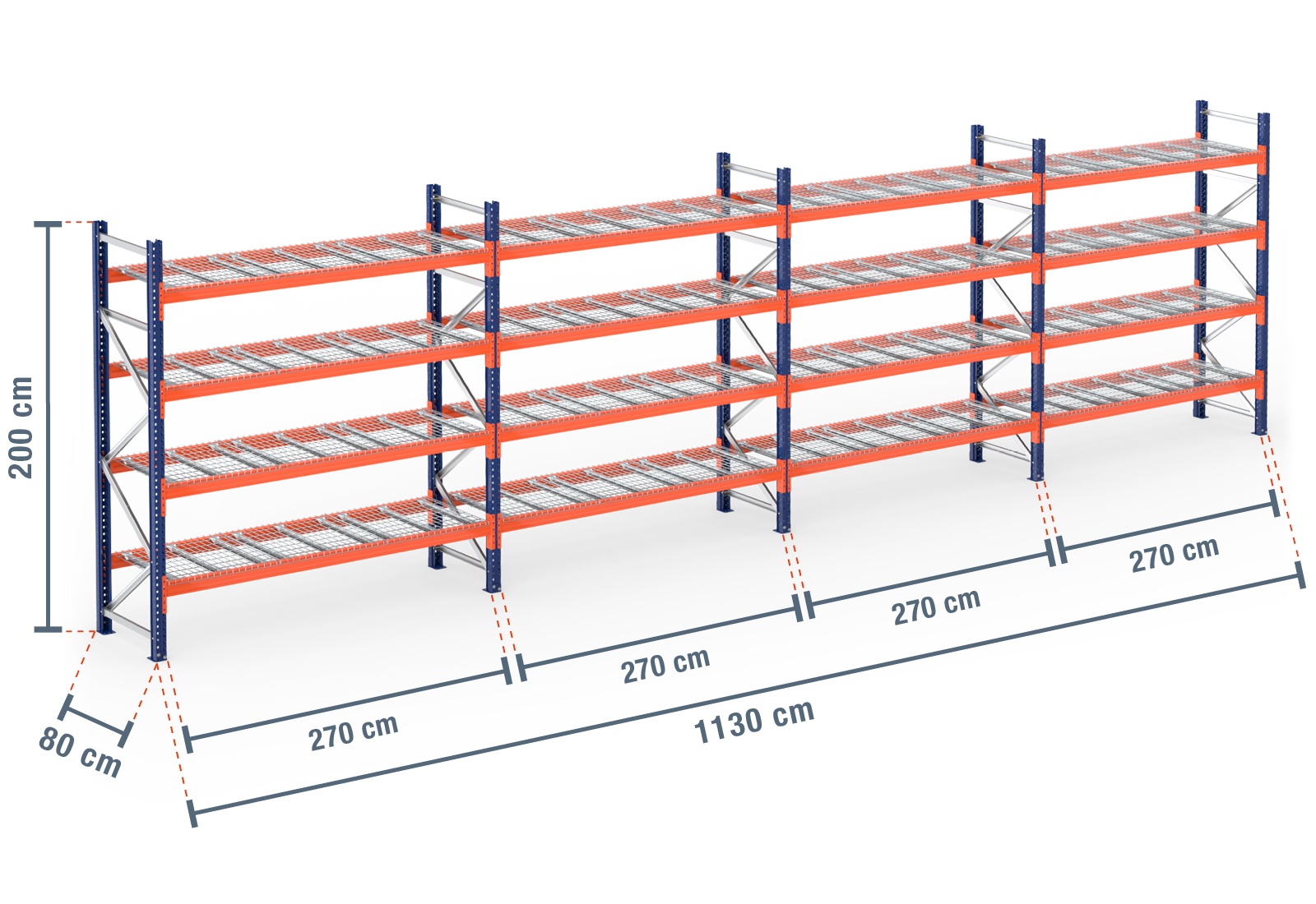 11,3 m pallet racking PR4500 / 80 cm deep / 2 m high / 4 levels / rack layer Wire mesh
