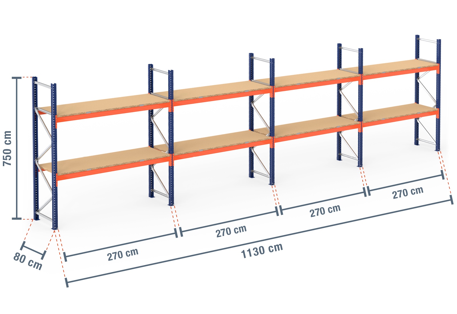 11,3 m pallet racking PR4500 / 80 cm deep / 7,5 m high / 2 levels / rack layer Wood