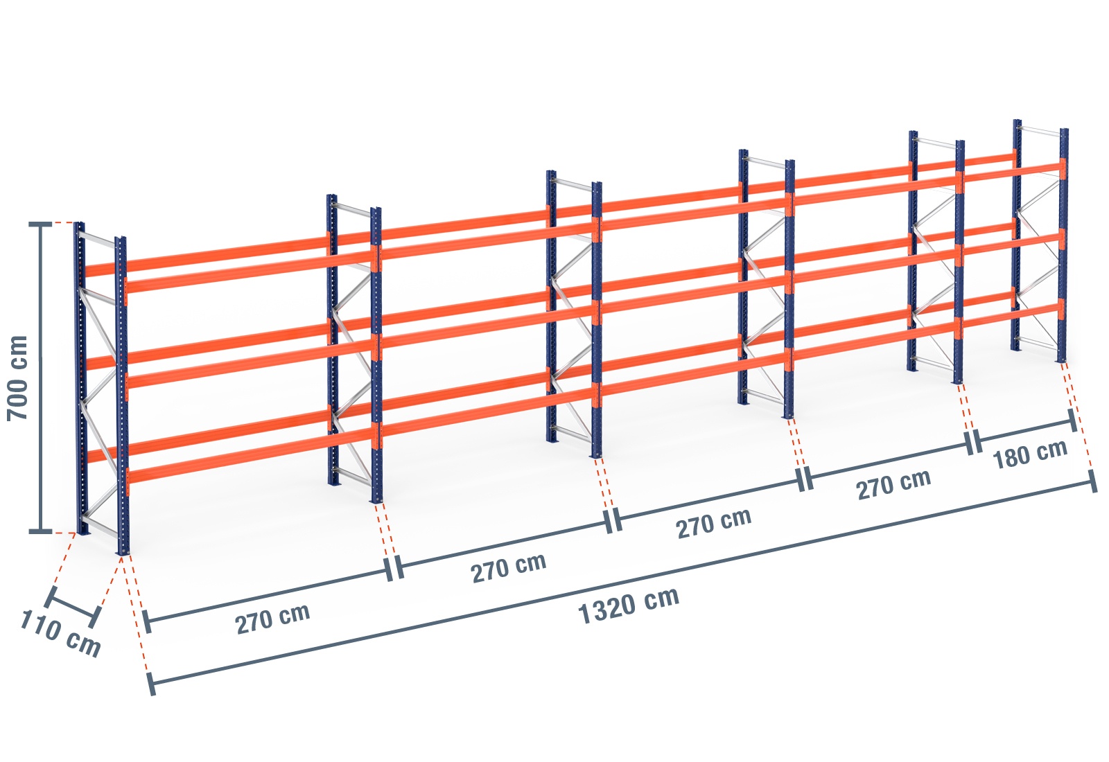 13,2 m pallet rack PR4500 / 110 cm deep / 7 m high / 3 levels for 56 euro pallets