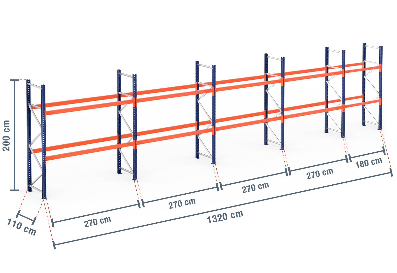 13,2 m pallet rack PR9000 / 110 cm deep / 2 m high / 2 levels for 42 euro pallets