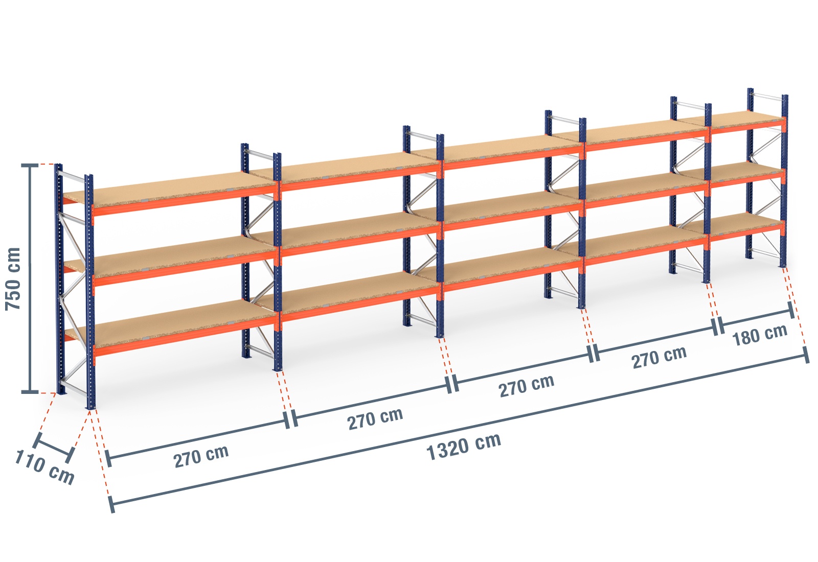 13,2 m pallet racking PR4500 / 110 cm deep / 7,5 m high / 3 levels / rack layer Wood
